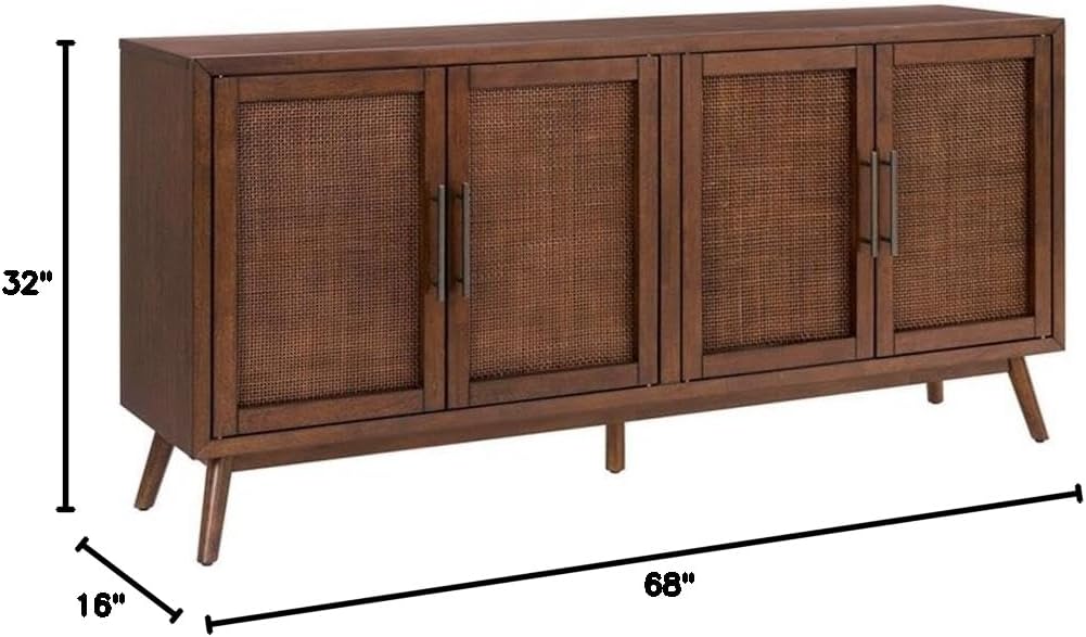 This Four-Door TV Stand is a harmonious blend of style and functionality. Crafted from high-quality hardwood solids in a cinnamon brown finish and adorned with soft woven raffia door fronts and oil rubbed bronze handles, this cabinet exudes warmth and sophistication. The interior features two adjustable and removable shelves, providing customizable storage solutions. The back features wire management cutouts, effortlessly accommodating a TV up to 65 or 70-inches. Whether gracing your living room as an entertainment console, your dining room as a space saving sideboard, a hallway accent piece, or a storage solution in bedroom, this chest seamlessly complements any space. Tapered legs accentuate the timeless mid-century modern design, making it a statement piece that enhances the aesthetic appeal of any room in your home.Features:- Warm cinnamon brown finish adds a touch of elegance to any room; Hardwood frame and natural woven raffia door fronts exude a subtle organic touch that effortlessly combines modern design with classic and coastal materials- Versatile storage options with one (2) interior adjustable and removable shelves; Wire management cutouts ensure electronics are discreetly integrated into your home décor- From the living room to the dining room, this TV stand is designed to complement various spaces, offering a versatile storage solution that adapts to your evolving interior design preferences- Elevate your décor with tapered legs and a timeless mid-century modern design, blending classic style with contemporary functionality for a standout piece that transcends trends- Assembled dimensions: 68” W x 16” D x 32” H- Assemble in minutes with the provided hardware and easy to follow instructions- Anti-tip kit included for added safetySpecifications:- Number of Shelves: 2- Color/Finish: Cinnamon Brown- Material: Wood- Commercial/Residential: Residential- Product Dimensions: 68" W x 16" D x 32"H