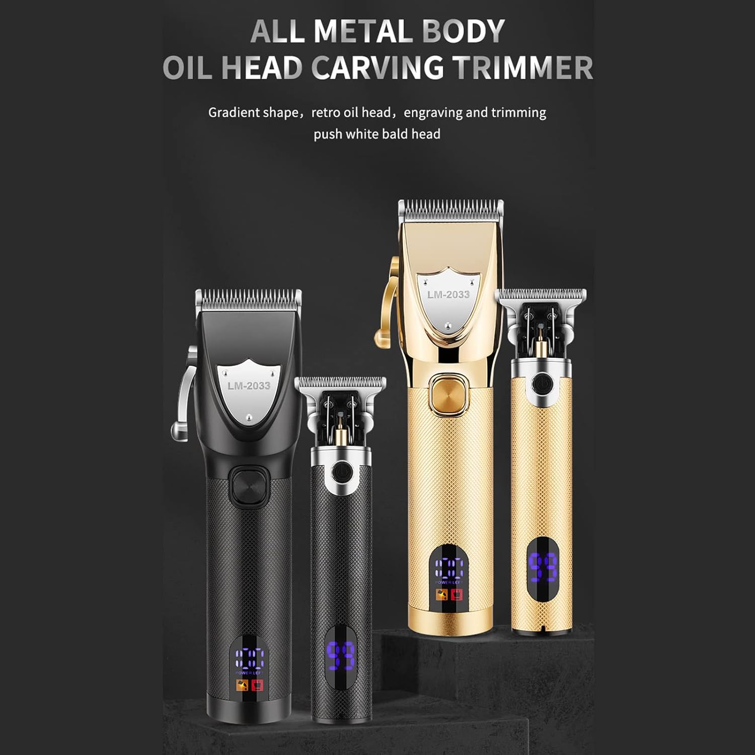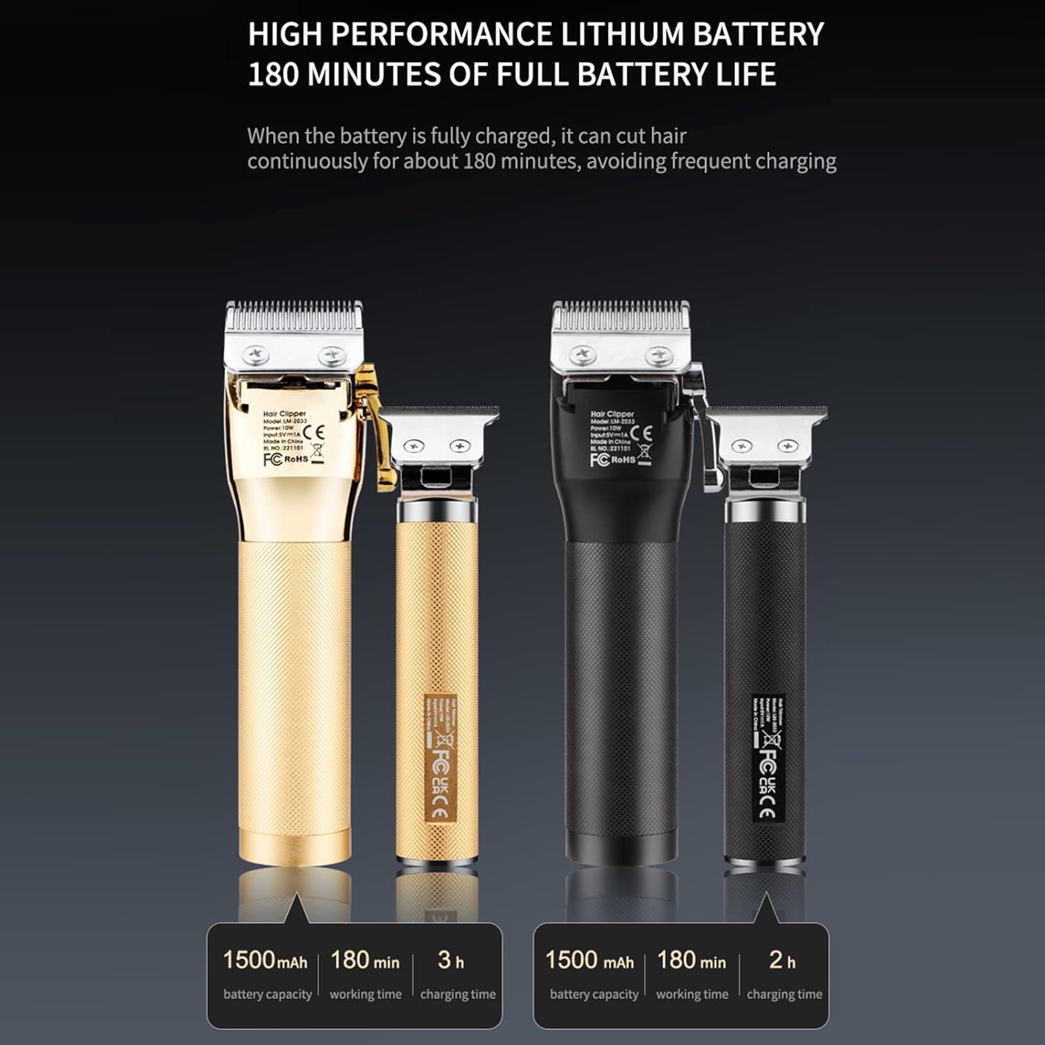 Specifications: Item quantity: 2pcs/set Material: Stainless steel Color: Black, Gold (optional) Voltage power: 110-240V/10W Battery capacity: 1500mAh (large) / 1500mAh (small) Charging time: approx. 3 hours (large) / 2 hours (small) Operating time: 180 minutes (large) / 180 minutes (small) Package List: 2 * Hair Trimmer 2 * USB Cable 12 * Large machine limit comb 4 * Small machine limit comb 1 *Cleaning brush 1 *Hairdressing comb 1 *Black bib 1 *EVA carrying case