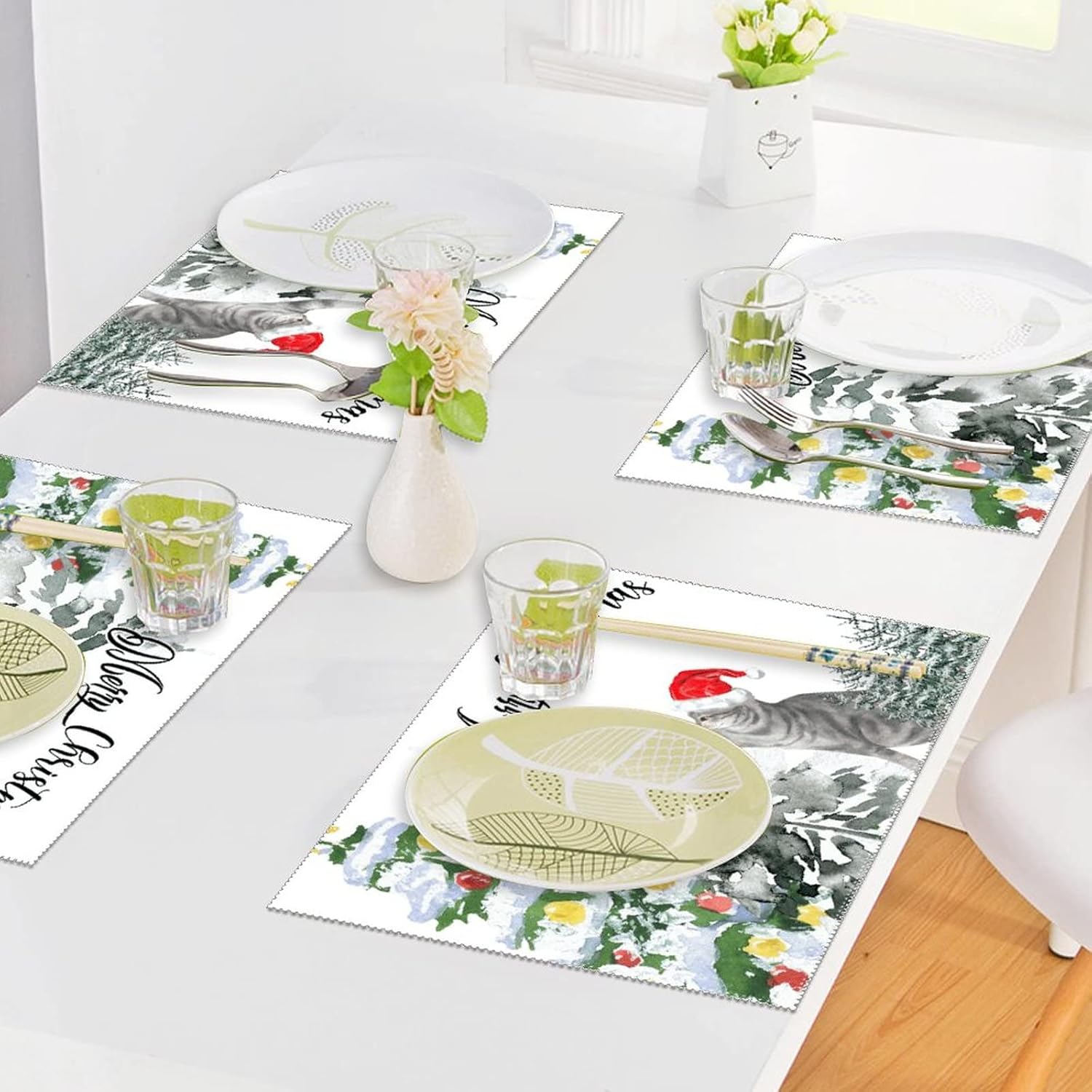 Meowy Christmas Cat Outdoor placemats Christmas Tree Cat Table placemats Black Cat Tree Tablemats Heat Resistant Washable Table Mats Non-slip Stain Resistant Pad Kitchen Table Mats Easy to Clean Set of 6FEATURES:1.Material: 70% PVC 30% polyester2.Size:18" × 12"(45cm X 30cm)3.Package:Table placemats Set of 4/64. Heat-resistaint: Durable and this can protect dinner table from the high temperature of cooks more effectively.5.Washable:PVC material does not absorb water, so it is easy to rinse with water .6.Applicability:Both indoors and outdoors suitable for, but not limited to restaurants, cafes, desks, living rooms, coffee tables etc. Even you can use it in the drawer of the table.7.Gifts:Great gift idea for all occasions, Christmas, Wedding, Fathers Day, Mothers Day, Valentines, Thanksgiving.CARE INSTRUCTIONS:Never clean them by the dishwasher machine and put them into microweave