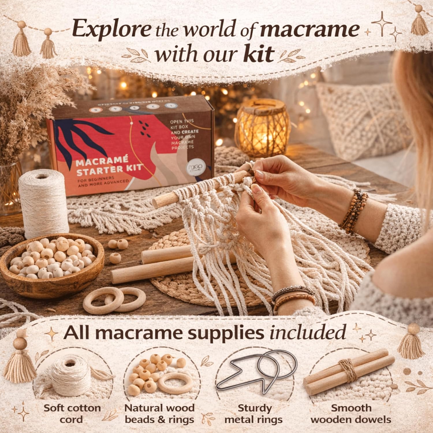 | Included Components | 165 yards of premium 3mm macrame string, wooden dowels, wooden beads, dreamcatcher rings, 2 wooden rings, key clips for macrame keychains, an organizer for macrame beads and measuring tape |