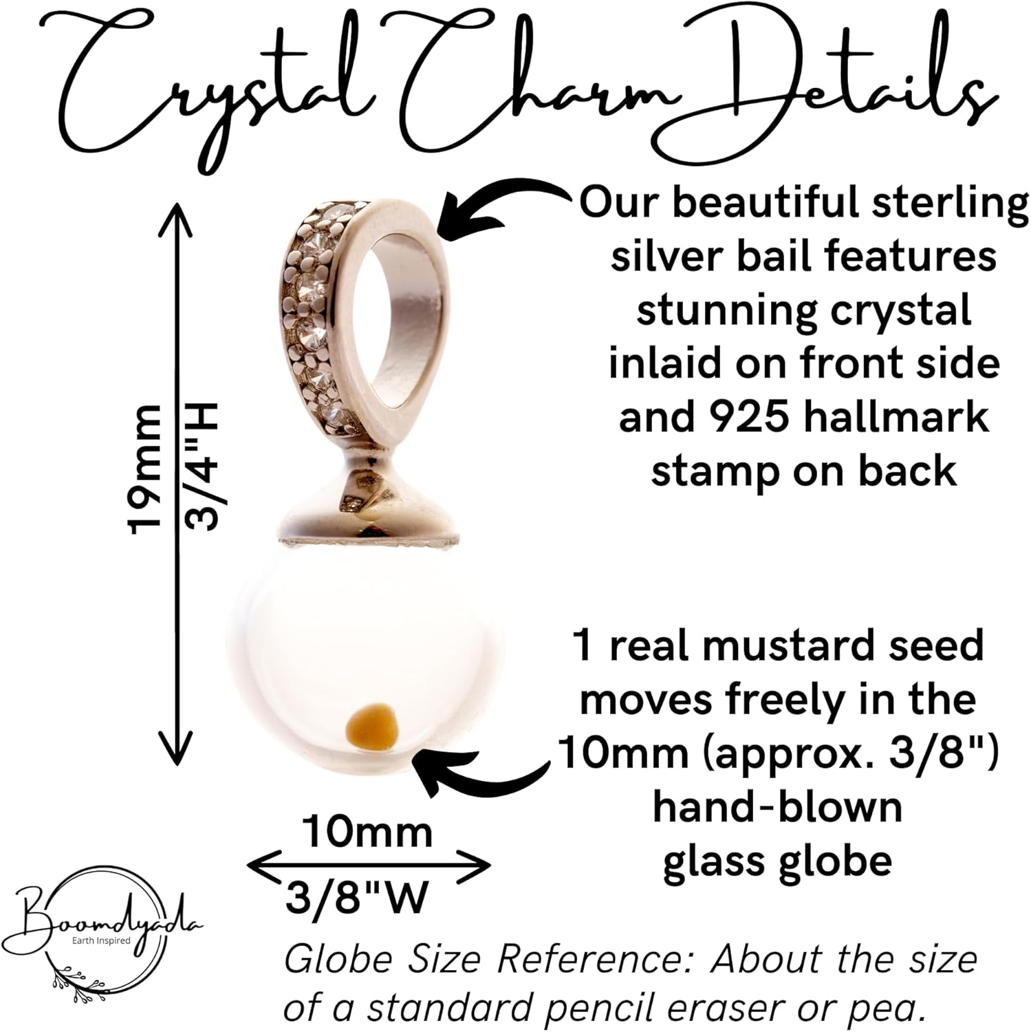 This elegant, hand made mustard seed necklace has a large solid 925 sterling loop, and tiny crystals inlaid along the outer side. It is hinged for easy removal or transfer to another choker, chain or scarf. 1 tiny mustard seed is enclosed in a 10mm hand blown glass globe and topped with the sterling and crystal loop. The finished pendant is approx. 3/4" tall and 3/8" wide. It is paired with a dainty but sturdy 1.3mm, 18" long beveled sterling silver cable chain. Mustard seeds are a beautiful reminder of the power of faith..."If you have faith as small as mustard seed...nothing will be impossible." Matthew 17:20 My mustard seed necklaces were inspired by a charm that my mother gave me as a child. It is still one of my dearest treasures. I make each one in sterling so that it will last, and with the prayer that it will bring faith, hope and love to the one who wears it. Each necklace comes enclosed in a (black) fine jewelry box, fixed to the metallic gold scripture card pictured, and includes a protective sleeve.