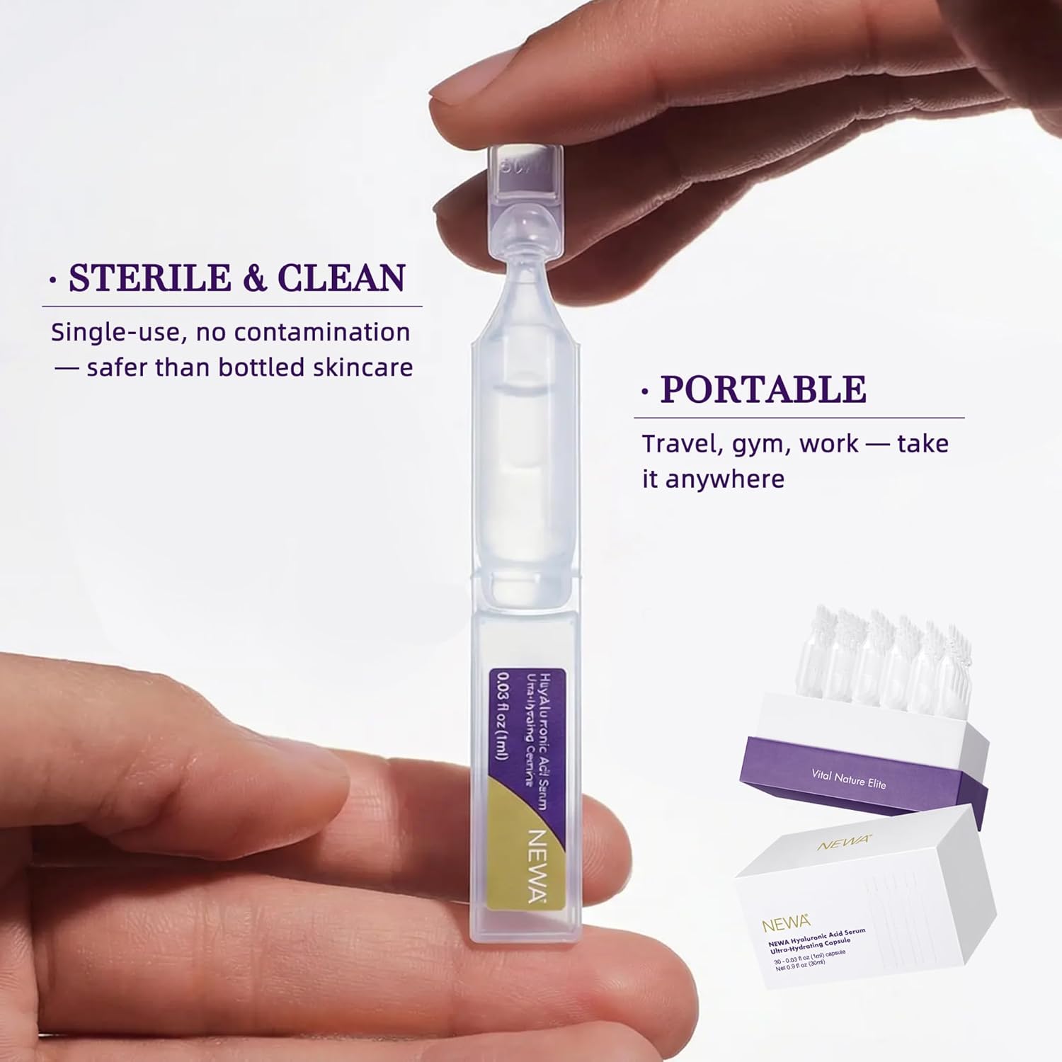NEWA Hyaluronic Acid Serum for Skin Repair is your go-to solution for achieving deeply hydrated and rejuvenated skin. This advanced serum features a potent concentration of Hyaluronic Acid, designed to provide intense moisture and support skin repair. Its lightweight, non-greasy formula penetrates quickly, helping to improve skin texture and reduce the visible signs of aging. WNP uses Blow-Fill-Seal technology to ensure that our serums are fully sterile, from production to packaging. This technology is usually only found in medication packaging. This means no preservatives for you, and a cleaner product for your skin. Compared to traditional skincare packaging, our single-use vials are purer, and thus safer. This packaging is also great for travel, as well as for carrying around in your everyday bag. The WNP Serum can be used in a variety of ways: As a daily essence As a primer before makeup application Mixed into lotion for boosted hydration Use half a capsule before using a mask, and apply the remaining half after taking off the mask, for deep hydration As a hair mask