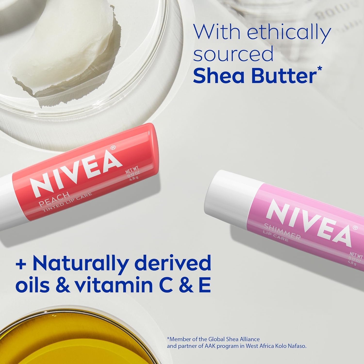 Give your lips the ultimate care and a touch of color with NIVEA Peach and NIVEA Shimmer Lip Care. This set includes NIVEA Peach Lip Care, featuring a delicious peach flavor and a beautiful coral lip tint with subtle shine, and NIVEA Shimmer Lip Care, enriched with Pearl Extract for a radiant shine and subtle pearly lip tint. Both lip balms are infused with ethically sourced Shea Butter(1), Nourishing Oils, Vitamin C, and Vitamin E to deeply moisturize, repair, and soften dry lips. Each lip balm is made with 98% naturally derived ingredients(2) and cares for your lips and the planet with thoughtfully sourced ingredients. Keep these hydrating lip balms in your desk, pocket, purse, or car for healthy-looking, radiant lips at a moment’s notice. Apply throughout the day for all-day nourishment, subtle color, and luminous shine. (1)Member of the Global Shea Alliance and Partner of AAK program in West Africa Kolo Nafaso. (2)Naturally Derived Ingredients have undergone processing while retaining a majority of their natural molecular structure. 2% skin safe synthetic ingredients are included to maintain the integrity of the product (see individual packaging for details).