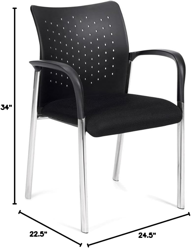 Perforated high style plastic back with mesh fabric seat.- Black seat/back.- 34"H x 24 1/2"W x 22 1/2"D.- Partial assembly required.- Molded armrests.- Oval tube chrome frame.- Can be nested up to five chairs if needed.- Packed 2 chairs per carton.- Not UPS-able.- Seat Height: 18".- Seat Width: 18".- Seat Depth: 18".- Back Width: 18".- Back Height: 15".- Arm Height: 8".- Sold as 2/Carton.