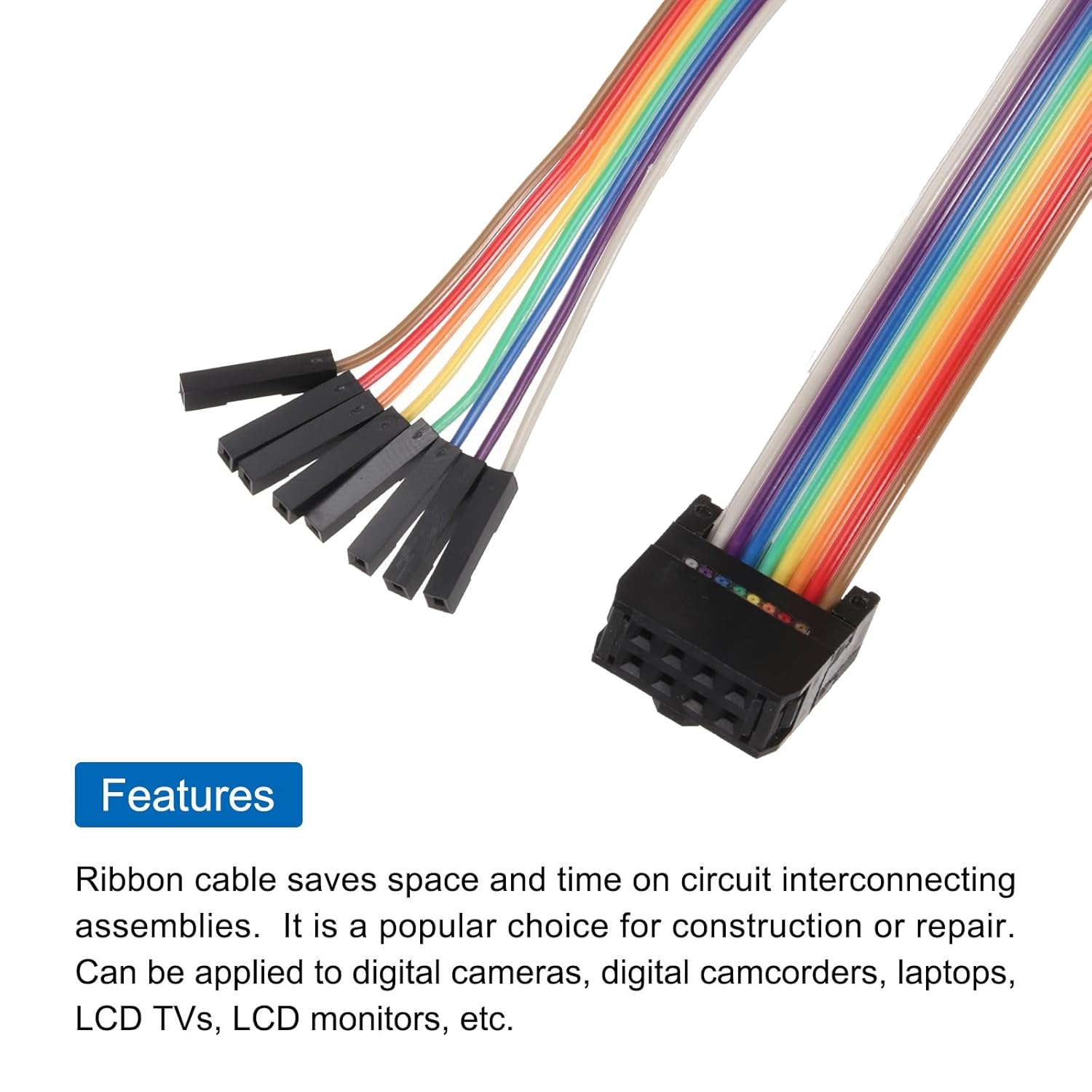 What is it? This ribbon cable is suitable for a variety of applications including DIY electronics, hobby projects, prototyping and more, such as sensors, motors and LED lights. What will I get? Package includes: 2 x IDC rainbow wire. Pin Number: ; Pin Pitch: 2.54mm; Wire diameter: 1 mm. Total size: 19.6 inches x 0.39 inches (L x W). Connector Type: FC Female to 8P; Are there any advantages of the product? Ribbon cable saves space and time when connecting circuit assemblies. It is a popular choice for construction or repair. Can be applied to digital cameras, camcorders, laptops, LCD TVs, LCD monitors, etc. How to use it? Connect the corresponding end of the cable to the corresponding plugs or pins on your devices. What should I pay attention to? 1. Make sure the pin spacing of 2.54mm matches the plugs or pins you connect to. 2. Check the wire diameter of 0.9mm to ensure compatibility with your devices.