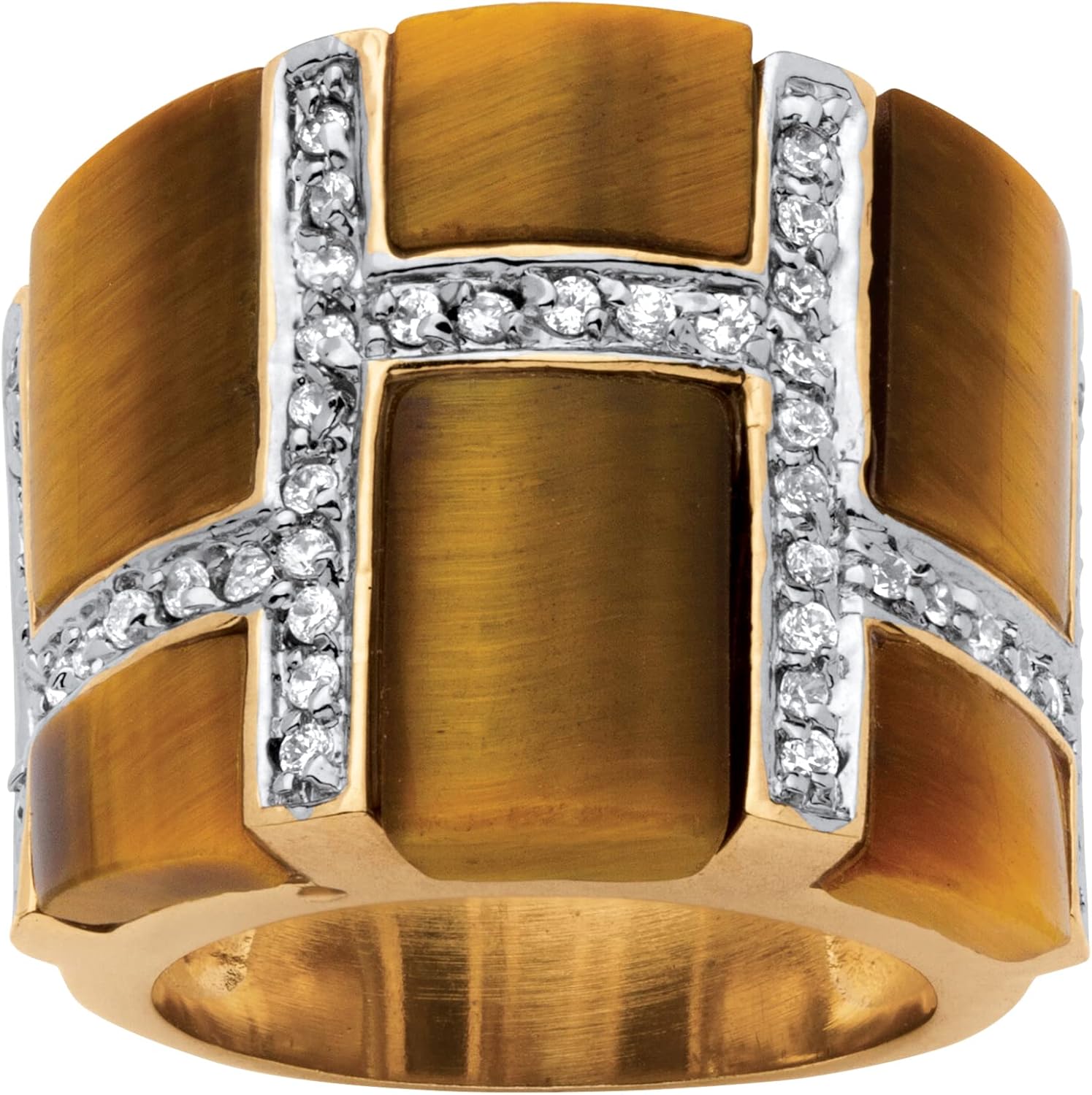 Bold geometric ring gleams with captivating tiger's-eye outlined by cubic zirconia accents, .46 carat T.W. Exciting embellishment for the modern fashion collector. Gold-plated. Sizes 6-11. We recommend that you order one size up for this style. (All carat weights are approximate and may vary slightly from those listed.) - 50075