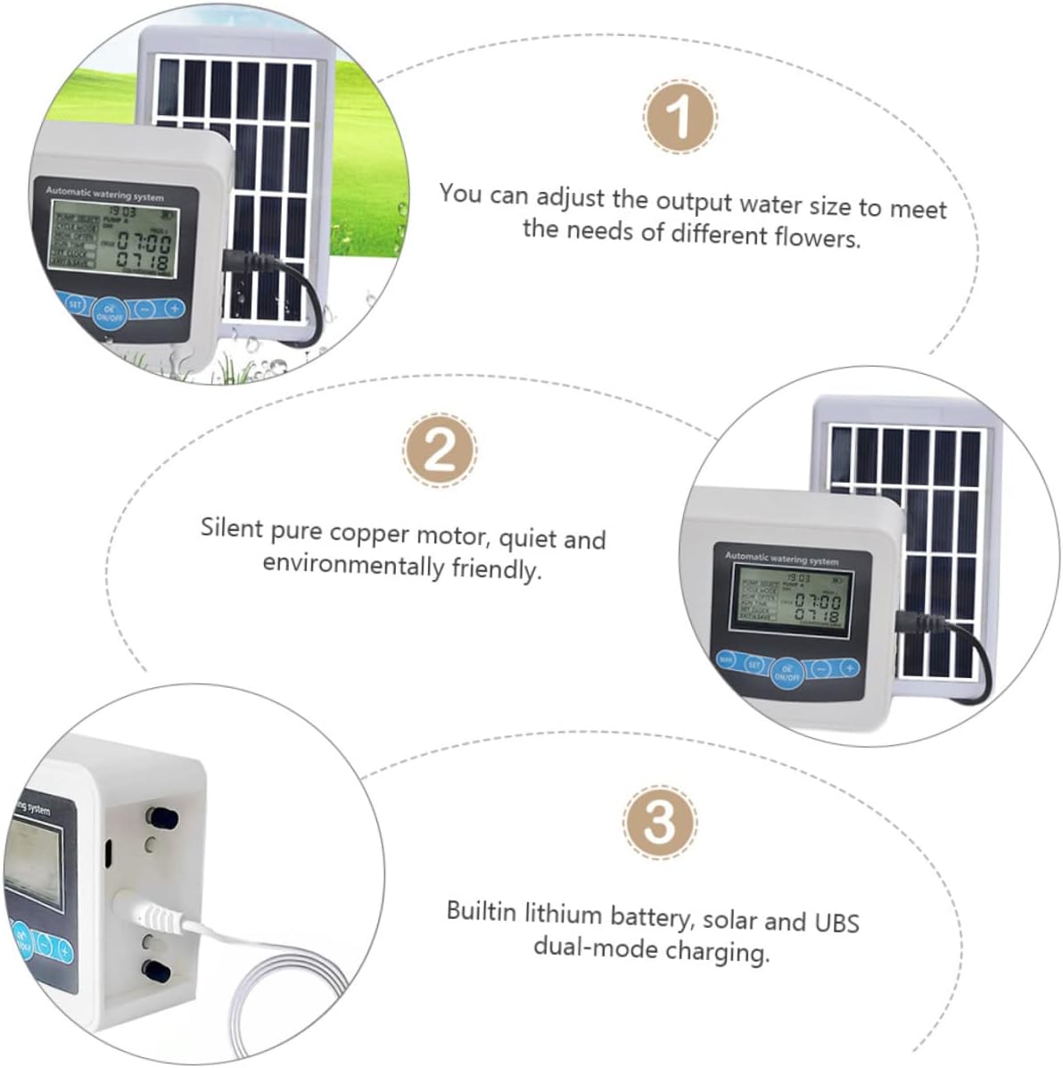 Package Include 1 x watering timer 1 x USB cable 1 x solar panel Features - Pump flow: 850ml/min double pump watering timer. - Color: As Shown watering device. - Battery capacity: 1200 mAh automatic watering controller. - Motor power: 5W watering controller. - Size: 12.00X8.90X4.30cm/4.72X3.50X1.69in irrigation controller - Battery voltage: 3.7V timing watering device. - Input voltage: 4.2V-5V digital water timer. - Material: ABS. - Waterproof grade: PI67 rainproof. - Interface type: micro USB. - Made from for use. for home, garden and agriculture production use, etc irrigation timer. - Equipped with two water pumps , which can be selected arbitrarily, and also can work alone watering timer. - Set three groups of watering time arbitrarily every day, the watering 0-9999 seconds solar watering timer. - There are two recurring modes based on days and hours to meet your need. - It is easy to install and convenient to use. Built-in solar and USB dual-mode charging.Goods Descriptionsolar watering timer automatic watering timer, made from material, is and for long time use.watering controller Double pump water supply, can be switched to single pump, can adjust the output water size to meet the needs of different flowers.double pump watering timer It will be one of the for you.automatic watering controller Perfect for garden and home use