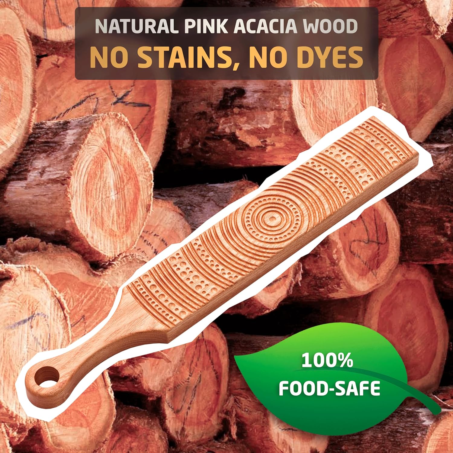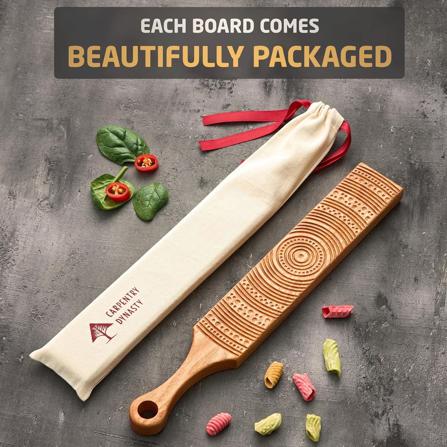Bring authentic Italian tradition into your kitchen with this Premium Solid Exotic Hardwood Pasta & Butter Board, handcrafted from 100% solid Merbau, Padauk, Purpleheart, or Gleditsia (Pink Acacia) wood.Perfect for shaping gnocchi, cavatelli, garganelli and more, this versatile tool also doubles as a butter pattern board, creating elegant ridges and designs for serving butter in style. Whether preparing homemade pasta or enhancing your table with artisanal butter, this board is both functional and beautiful.Why Exotic Hardwood? Each board is crafted from dense hardwood with natural oils and resins for durability. Merbau’s deep red-brown with golden streaks, Padauk’s vibrant orange-red, Purpleheart’s rare purple hue, and Gleditsia’s warm pink-brown all make every piece unique in color and grain. No two boards are alike — your board will be truly one of a kind.Features:Handmade exotic hardwood board – ideal for gnocchi, cavatelli, garganelli, cavarola, macaroni, and trofieButter pattern tool – creates elegant butter ridges for a restaurant-style lookDouble-sided design – extends the life of the board and provides more patterns in one tool, offering extra pasta shapes and butter designs compared to single-sided boardsFinished with food-safe mineral oil for lasting protection and a smooth surfaceVersatile – doubles as a cheese or charcuterie serving boardGift-ready – beautifully packaged, perfect for pasta lovers and foodiesDimensions: 2.2" x 15" (56mm x 381mm) Weight: Approx. 10.6 oz (may vary due to natural wood density)This isn’t just a kitchen tool — it’s a luxury Italian-inspired pasta and butter board that blends timeless style with everyday functionality.
