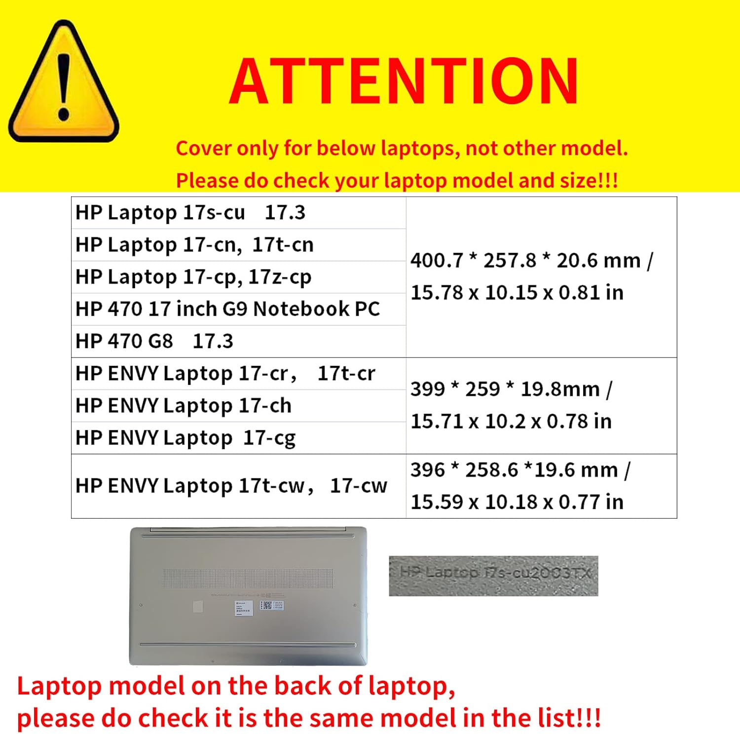 This case/cover only for below laptops, not fits other laptops. Please do check your laptop model. The laptop model is on the back of your laptop.This cover dimensions:40.2*27*2.5cm, 15.82*10.63*0.98inch, 0.54kg, measure by hand. Only for below laptop models:HP Laptop 17s-cu 17.3: 400.7 * 257.8 * 20.6 mm / 15.78 x 10.15 x 0.81 in"HP Laptop 17-cn, 17t-cn HP Laptop 17-cp, 17z-cp HP 470 17 inch G9 Notebook PC HP 470 G8 17.3 HP ENVY Laptop 17-cr, 17t-cr: 399 * 259 * 19.8mm / 15.71 x 10.2 x 0.78 in"HP ENVY Laptop 17-ch HP ENVY Laptop 17-cg HP ENVY Laptop 17t-cw, 17-cw: 396 * 258.6 *19.6 mm / 15.59 x 10.18 x 0.77 in"
