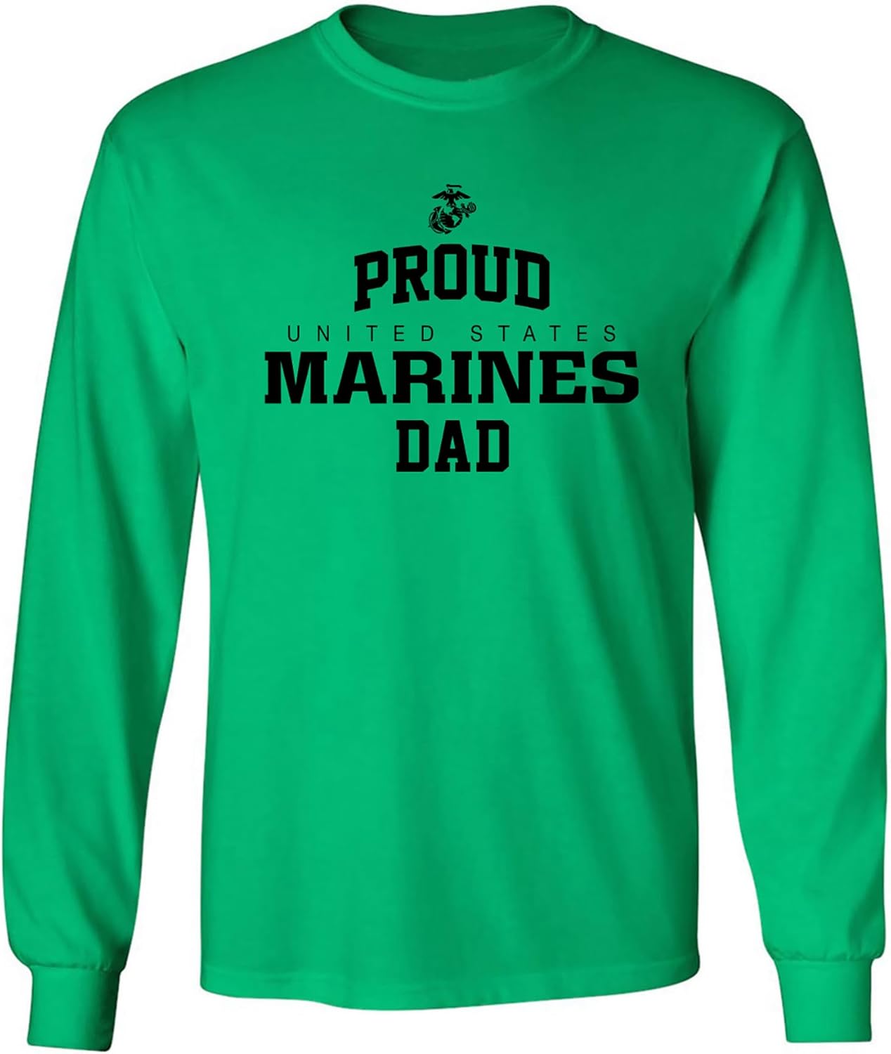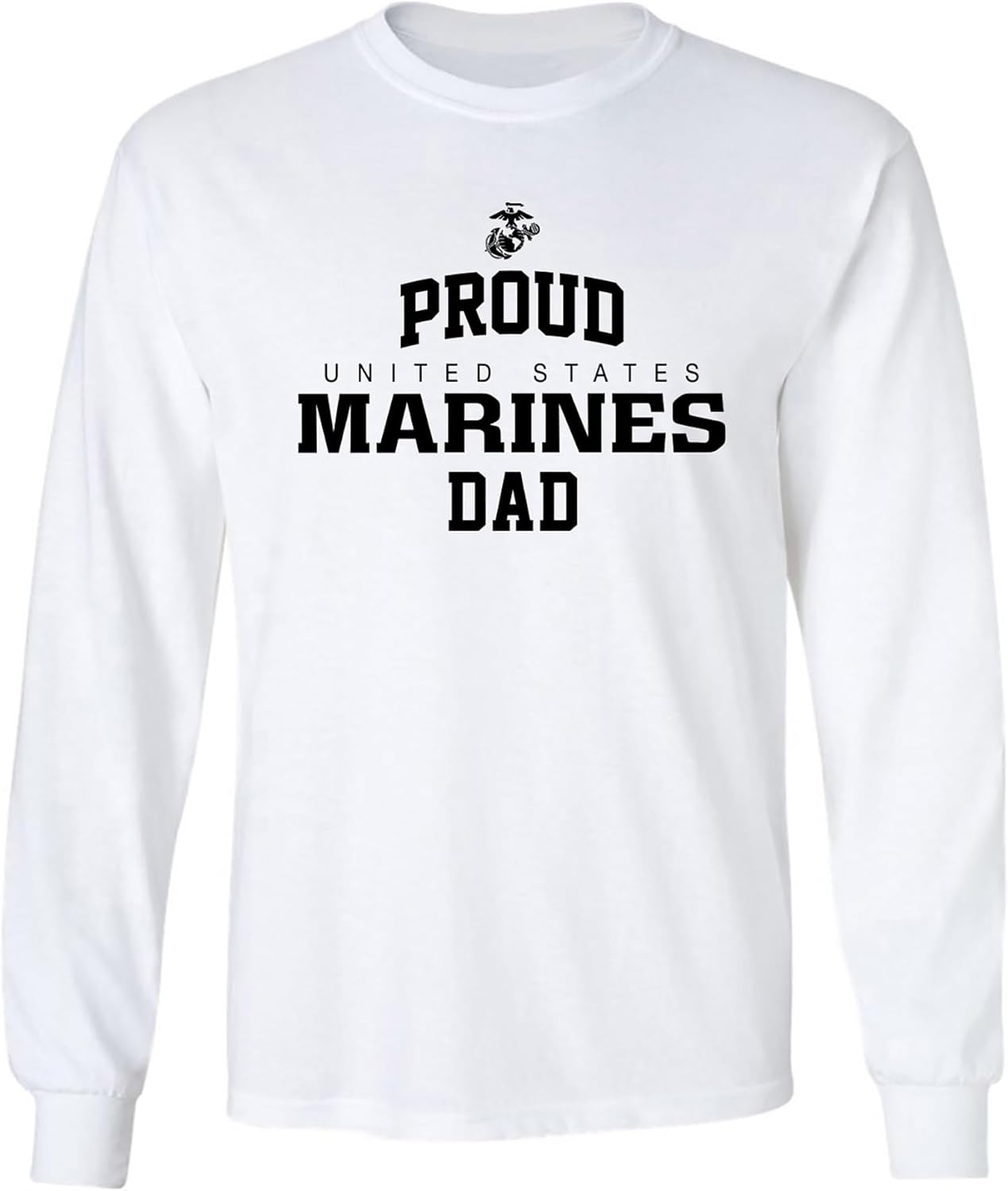 This military theme shirt features "Proud United States Marines DAD" on the front on an Adult Long Sleeve T-shirt. Taped neck and shoulders. Double-stitched sleeve and bottom hems, quarter-turned body. Officially licensed by the United States Marine Corps. Printed in the USA on an imported garment.