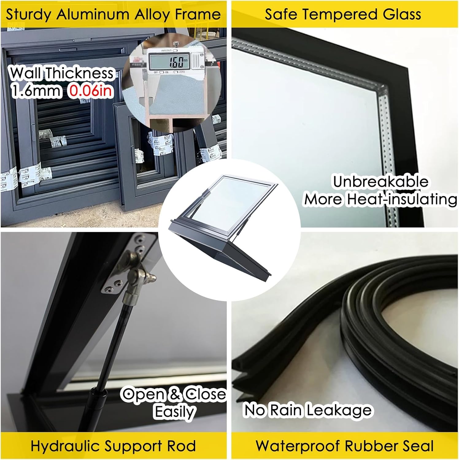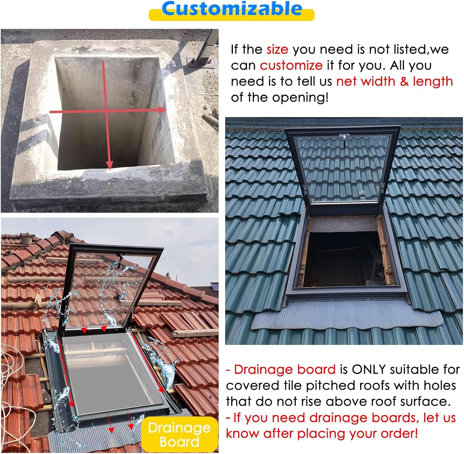 Are you worried about the quality of your roof access hatch lid in the face of stormy weather?Are you worried about leaking and structural fragility of your skylight?Just take a look at our Roof Hatch Covers! Provide secure and weatherproof protection for attic exits or roof windows.Specifications :- Material: Aluminum Alloy + Tempered Glass- Size: Customizable (Length x Width)- Opening Angle: 80°- Outer diameter of lid frame = Inner diameter of bottom frame + 10 cm/3.9 inches- Measuring Tip: Bottom Frame Inner Diameter Size ≥ Wellhead Opening Size- Roof access doors can only be opened and closed from the inside, not from the outside.Features :- Aluminium frame, seamless welding, weatherproof.- Handle & lock for added convenience and security.- Pre-drilled holes for bolts, maintenance free.- Escape skylight can only be opened from the inside to prevent unauthorized access.- Support bar of egress window to help you open or close the door easily.- Suitable for home decor, industrial, commercial, schools and other locations.- Embedded rubber seals prevent rainwater from seeping in.- Multiple sizes available, please measure accurately and choose the right size.Package Contents :- 1 x Roof Hatch Cover (with mounting screws)Notice:- Minor errors can be 1cm error due to different batches and manual measurements. Thank you for your understanding.- There may be chromatic aberration due to the difference between the recording lamp and the display. Please refer to the actual product.
