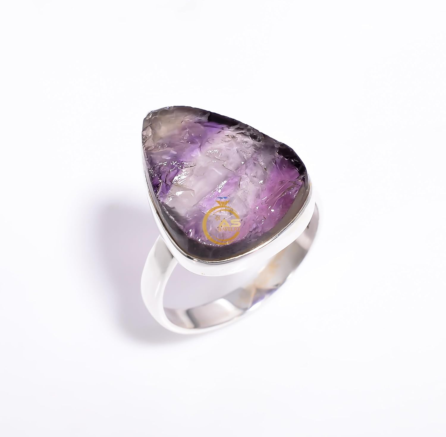 A raw ametrine ring is a unique and beautiful piece of jewelry that combines both amethyst and citrine gemstones in their natural, untreated form. Handmade with care and attention to detail, this statement ring is sure to stand out and make a bold fashion statement. The raw beauty of the ametrine stones gives the ring a natural and organic feel, perfect for those who appreciate the raw and unrefined beauty of gemstones. The combination of purple and yellow hues in the ametrine creates a striking contrast that adds a pop of color to any outfit. It's a one-of-a-kind piece that showcases the natural beauty of the gemstones and the craftsmanship of the artisan who created it》Product Details:- Product - Ring Metal - Pure 925 Sterling Silver Stamp - 925 Gemstone - Moldavite, Meteorite and Herkimer Diamond Gemstone Color - Green, Black and Clear Gemstone Treatment- No Treatment (Natural) Product Weight – 6.00gm Approximate 》About Quality:- Our products are completely handmade and made of pure 925 sterling silver and natural gemstones, so don't worry about the quality, 100% customer satisfaction guaranteed. 》Please Note:- Because it is a natural gemstone, some slight variations in color and pattern are expected. 》Thank you for visiting my shop!
