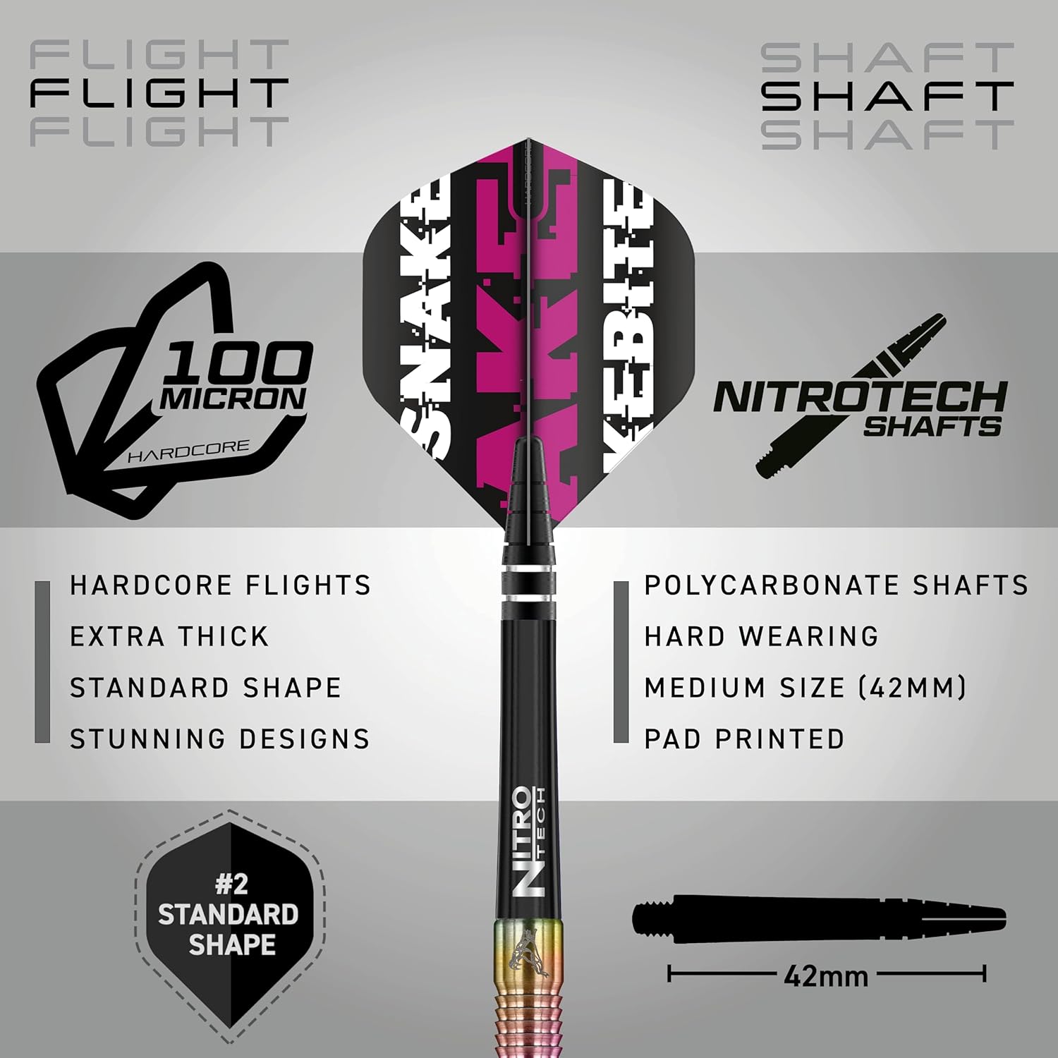 Set of 3 x 90% premium quality Red Dragon tungsten darts; Hardcore Snakebite flights; Red Dragon Nitrotech shafts; Red Dragon Pro Player