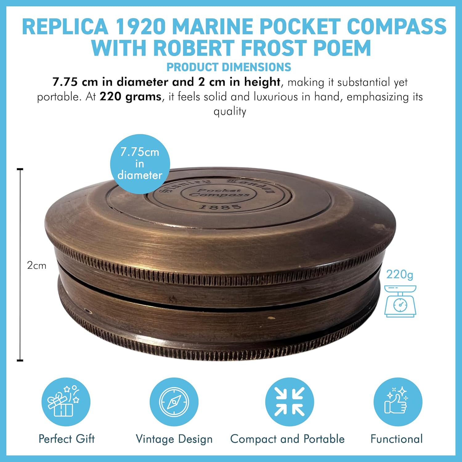 The Replica 1885 Stanley Marine Pocket Compass is a masterful blend of artistry, functionality, and history, making it an exquisite collectible for adventurers, history enthusiasts, and lovers of elegant craftsmanship. This vintage compass, made from distressed brass and glass, radiates timeless charm and authenticity, reminiscent of the golden age of marine exploration. Designed as both a decorative piece and a functional tool, this brass compass offers precision navigation with a magnetic needle that reliably points true north, whether you're hiking, traveling, or embarking on a nautical adventure. With its compact design, this pocket compass measures 7.75 cm in diameter and 2 cm in height, making it conveniently portable without compromising its luxurious feel, further emphasized by its substantial weight of 220 grams. The engraved compass lid features Robert Frostโs iconic poem, The Road Not Taken, adding a deeply personal and inspirational touch, making it the perfect personalised compass for gifting to a loved one or as a cherished keepsake. Whether you envision yourself as a modern explorer, a maritime enthusiast, or even a pirate of old, this nautical compass sparks the imagination and connects you to an era of seafaring discovery. The antique patina and distressed brass finish give the piece an authentic, rustic appeal, ensuring it fits seamlessly into any vintage or maritime-themed decor. Ideal as a pirate compass for imaginative play, a mini compass for practical use, or a beautifully engraved compass for meaningful gifting, this versatile treasure is a must-have. Its durable glass face ensures the compass needle remains well-protected while offering clear visibility for effortless navigation. Whether used as a precise navigation tool, a personalised brass compass for a special occasion, or a decorative vintage compass that doubles as a talking point, this piece exemplifies timeless quality and enduring style. From collectors to nautical enthusiasts and adventurers of all kinds, the Replica 1885 Stanley Marine Pocket Compass is the ultimate choice for those seeking a sophisticated and versatile pocket compass that embodies the spirit of exploration and the elegance of yesteryear.