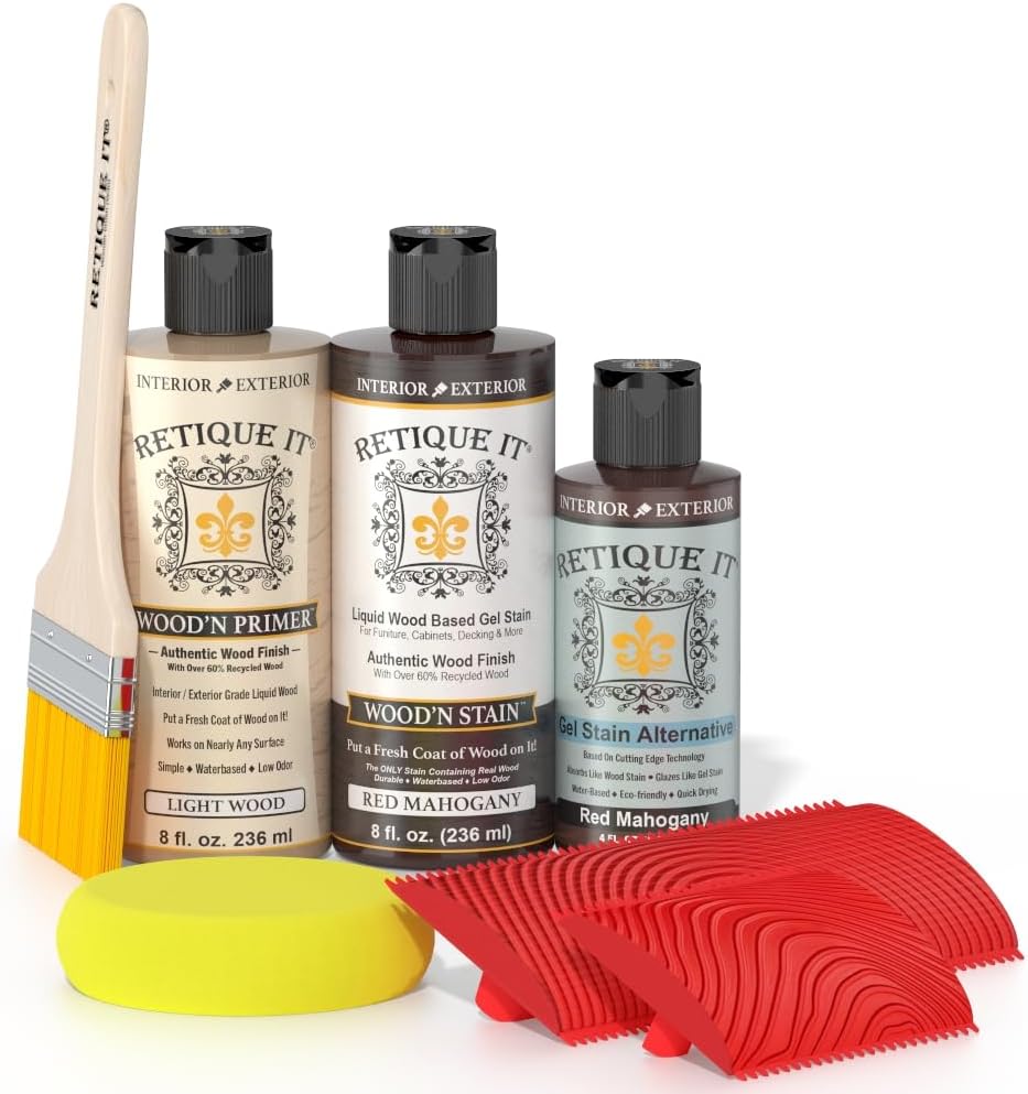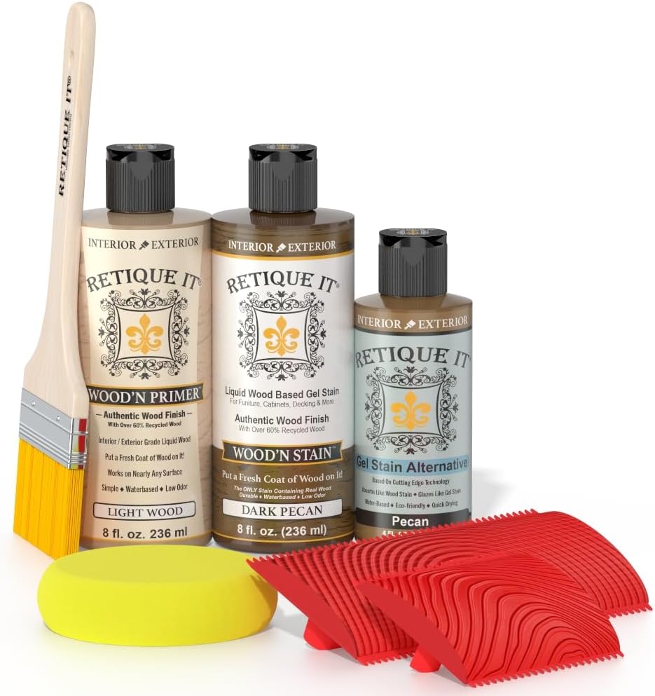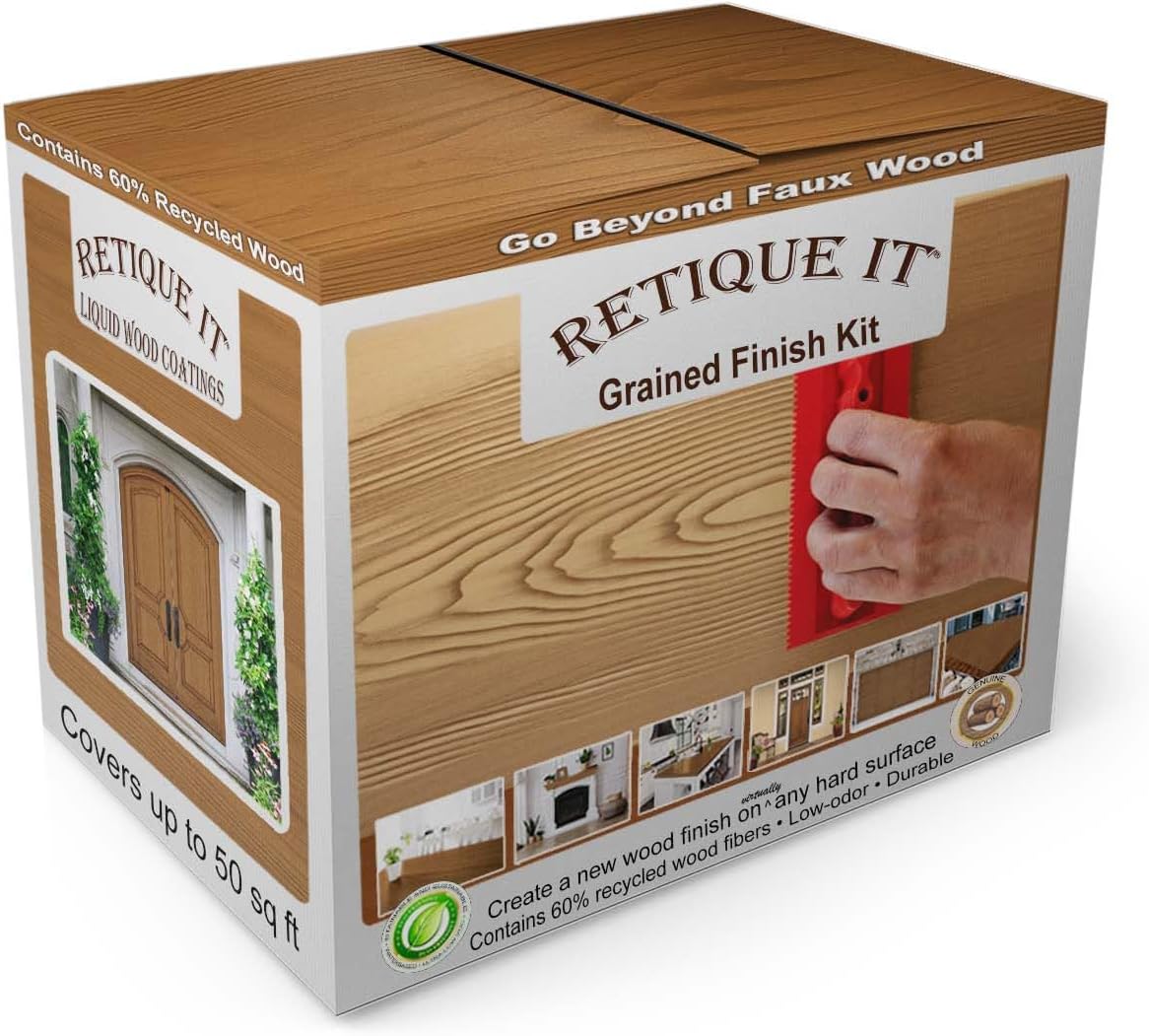 Retique It Liquid Wood Coatings contain a revolutionary new technology, which makes virtually any hard surface stainable without having to sand or strip off the old finish. The surface will become like bare wood because Retique It contains real wood fibers. The stain will absorb just like it is an unfinished wood surface. Your final finish will look and feel like a genuine wood finish because it is genuine wood. Great for Furniture, Cabinets, Doors, Drywall, Cement, Plastic, Metal and virtually any other hard surface! Just paint, then stain to get a genuine wood finish. Looks and feels like real wood because it actually contains 60% recycled wood fibers! If you want a well-defined grain, then you can use a graining tool kit. Just apply a second coat of Retique It, once the first coat is dry and then pull the graining tool through it while it is still wet. Use the same color or a different color depending on how defined you want the grain.
