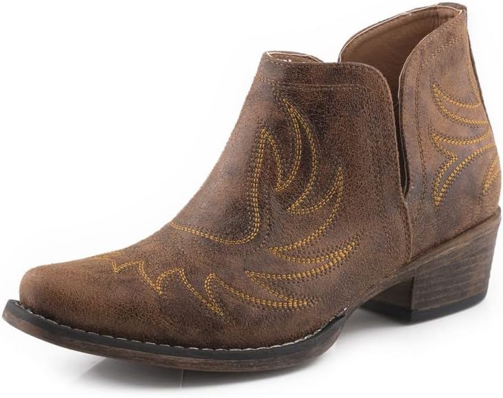 The Roper Ava booties are the perfect fit of Western chic and modern comfort. Fashion ankle boot made of a faux-leather upper with deep V-panels for easy movement and a stylish look. Soft man-made lining for a comfortable fit and feel. Padded insole for added underfoot comfort. Stacked heel with a scoured detailing. Snip toe. Lightweight man-made outsole with rubber heel cap for reliable traction.