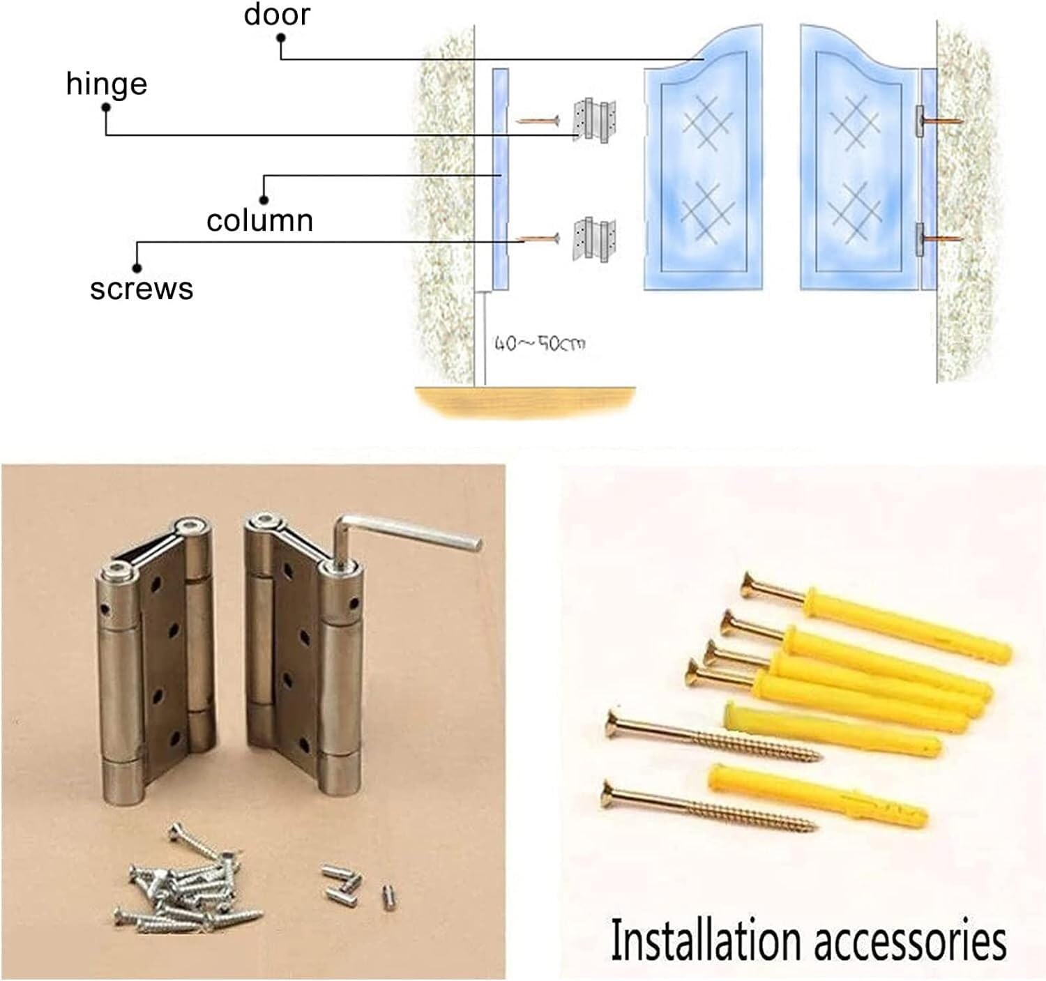 This double door design is perfect for bars, restaurants, or homes, adding an elegant entrance that exudes rustic charm. Coated with eco-friendly water-based paint, it ensures a safe and sustainable finish, making it an excellent choice for the environmentally conscious. The sturdy construction features a reinforced column and a gracefully curved door frame, providing long-lasting durability while elevating your space's aesthetic appeal. Our innovative hinge system, featuring double-action swing, auto-close, and hold-open functionalities, is ideal for busy areas, allowing for smooth and convenient access.Installation is a breeze with all necessary accessories included, streamlining the setup process. Plus, you can customize your door to match your decor perfectly—simply reach out to us with your desired dimensions and color preferences. Please keep in mind that slight color variations may occur due to lighting and display differences, adding a unique touch to your door.Material: Premium Pine Style: Double Door Color: Brown (Customizable) Dimensions: Width × Height in cm (inch), with adaptable total door frame width Middle Gap Width: 1–4 cm Process: Spraying, Hand-finishing, Grinding Package Includes: 1 Double Door