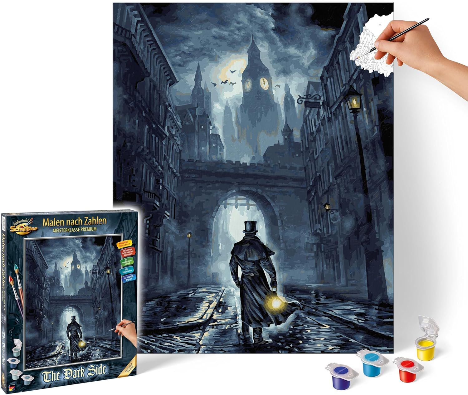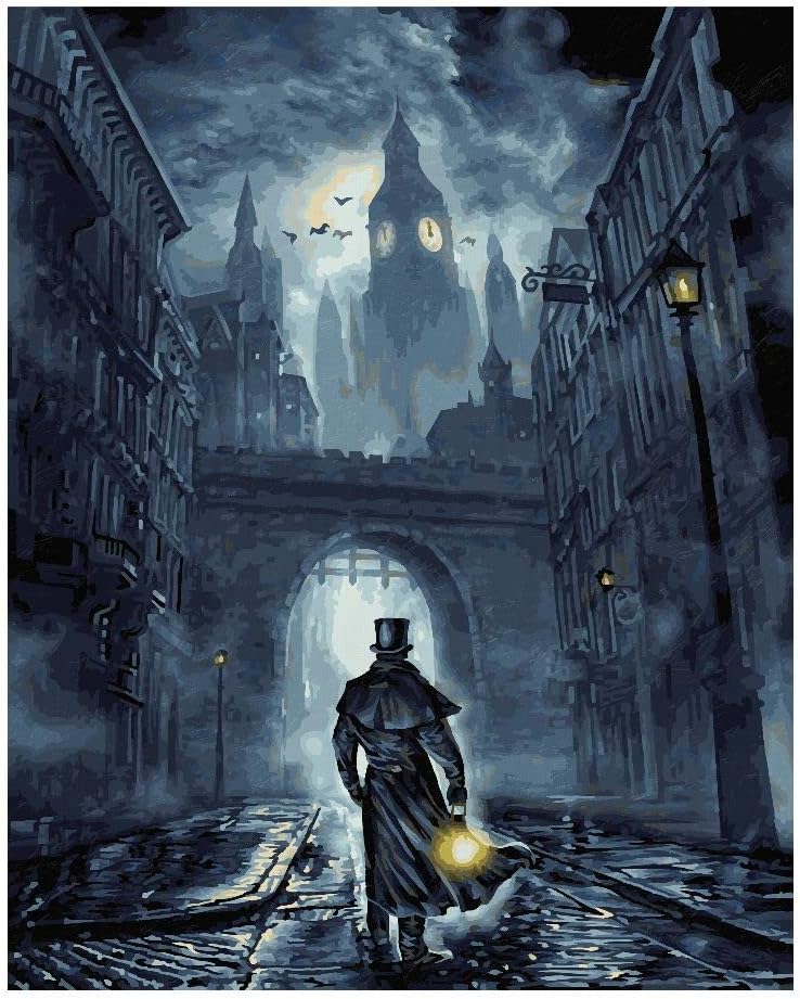 This spooky paint by number features an eerie evening in London as a man in a top hat and long coat carries a lantern down the dark streets as the full moon shines through the fog behind Big Ben. This premium paint by number kit is created by a well-known German artist with high-quality pre-mixed artist’s paints. Kit includes pre-printed textured art board, pre-mixed acrylic paints, artist paintbrush, and easy instructions. Finished painting measures 16 x 20" (40 x 50cm). Paint by number kit includes pre-printed textured art board, pre-mixed acrylic paints, artist paintbrush, and easy instructions. Artwork features a man in a top hat and long coat carrying a lantern down the darkened streets of London on a foggy night as bats fly in front of the full moon shining behind Big Ben in the distance. Painting measures 16 x 20" (40 x 50cm). Frame not included.