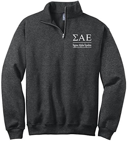 Our Sigma Alpha Epsilon quarter zip pullover is just perfect for this time of year. This pullover sweatshirt comes in dark heather grey and embroidered in white thread and sized S - 3XL. Our attention to detail and quality of embroidery sets us apart. All of our embroidered gifts are ready to leave our shop in California within 2-3 business days. Sweatshirt comes with SAE Greek letters and Sigma Alpha Epsilon embroidered below the letters. 1 x 1 rib cuffs and waistband.