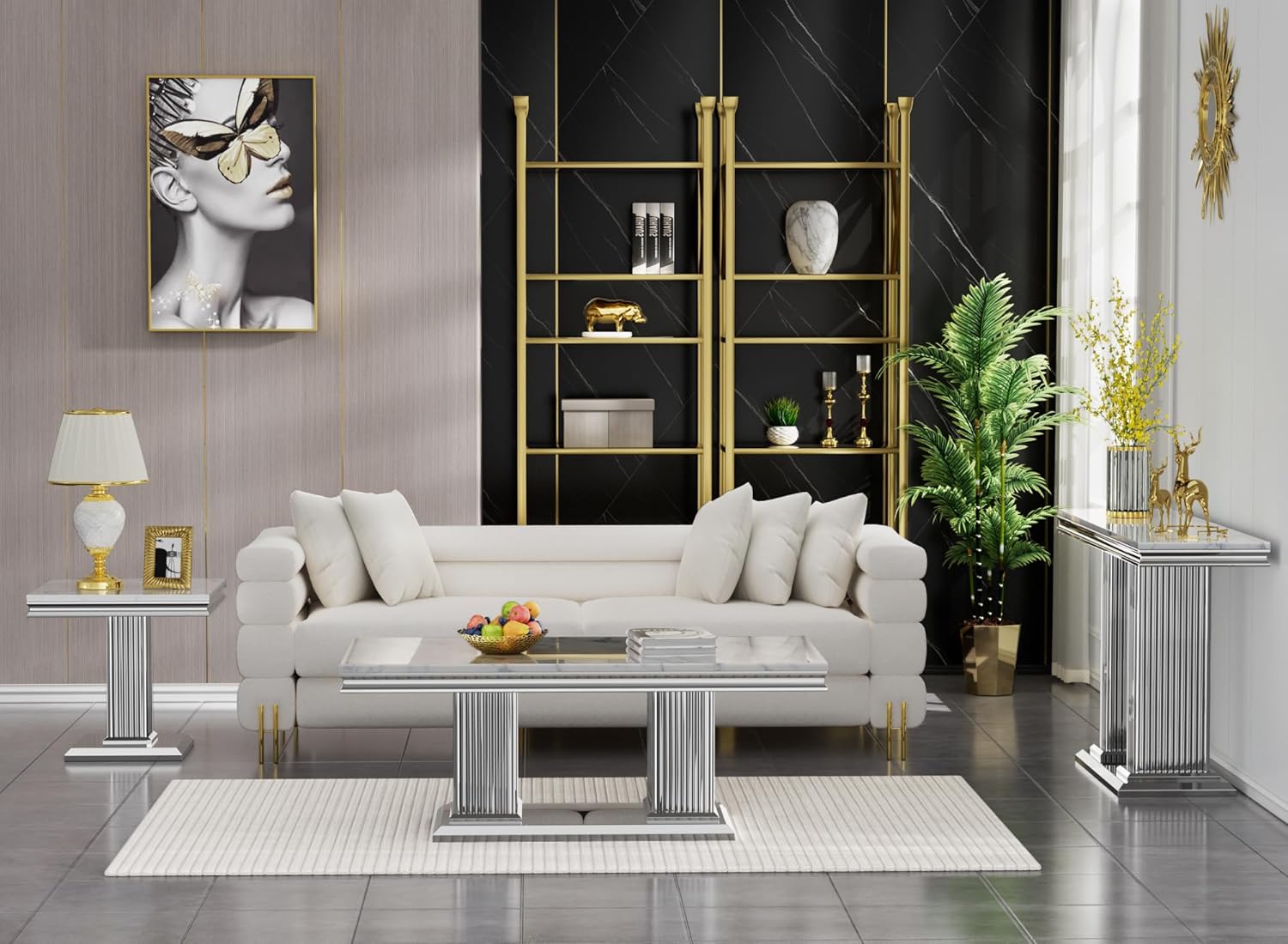 Material: MDF with Marble Grain & Stainless Steel Product Dimensions: 46.85 x 22.83 x 17.72"H Product Weight (lbs.): 73.63 Table Top Thickness: 0.71" marble printing MDF top Package Size&Weight:(2 Parcels) Package A: 32.28 * 16.14 * 13.38 in. 37.4 lbs. Package B: 50.78 * 26.37 * 4.92 in. 44 lbs. Item Include: 1 x Coffee Table