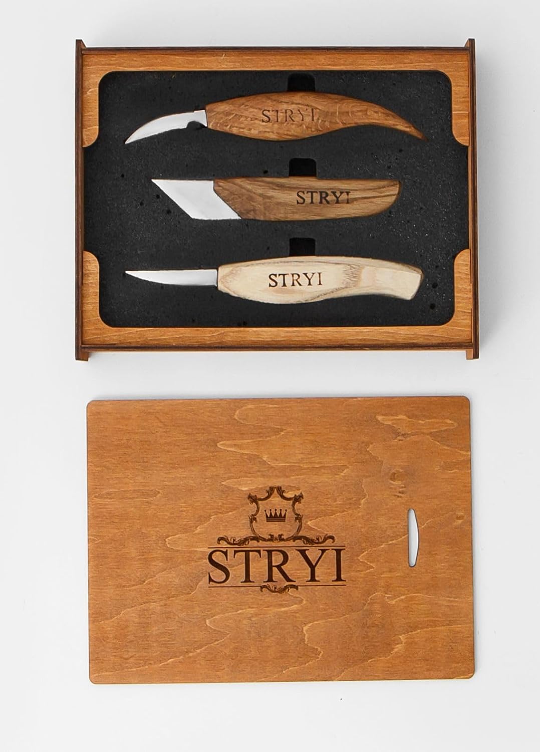 Wood carving knives STRYI Professional set of 3pcs in a wooden case is ideal for shaping, whittling, detailing, and creating figurines, as well as for making and decorating spoon handles, kuksas, and wooden jewelry. made in Europe by Master Craftsman in the Ukraine