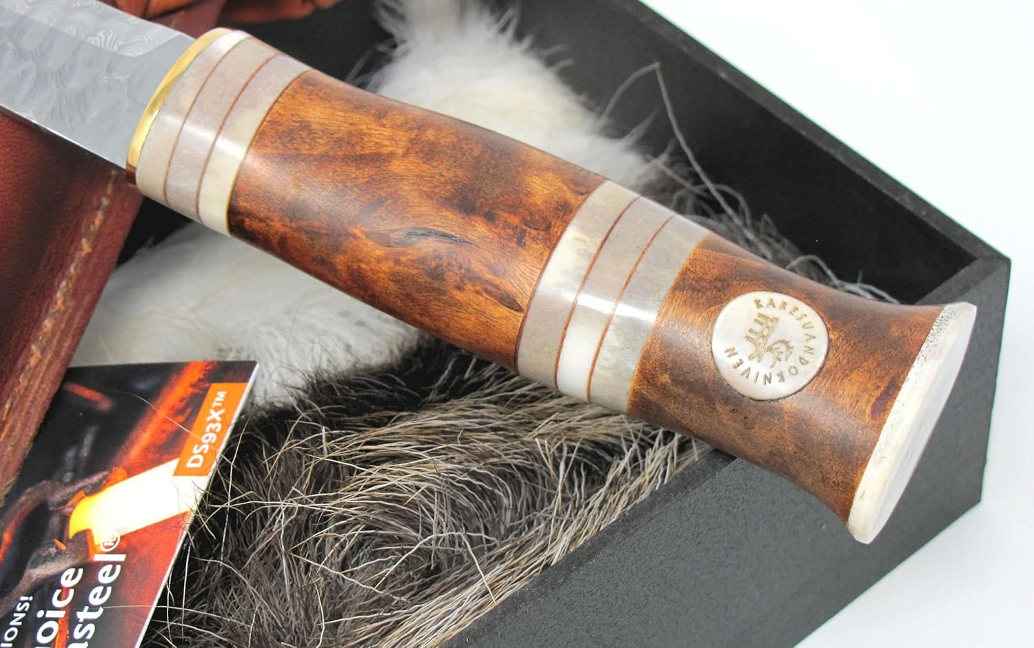 Blade Length 3.94 Inches Blade thickness [mm]3.2 Blade width [mm]21 Handle finish Glazing oil Handle material Curly birch Reindeer antler Brass Hardness HRC60 Steel grade Our Martensitic steel DS93XTM is an alloy of two different hardenable steel grades suitable for knives. It combines corrosion resistance with superior strength. An unique cutting ability is achieved through superior edge properties. Easy to maintain. An excellent steel for edge tools such as knives Knife, sheath, diamond sharpener, giftbox