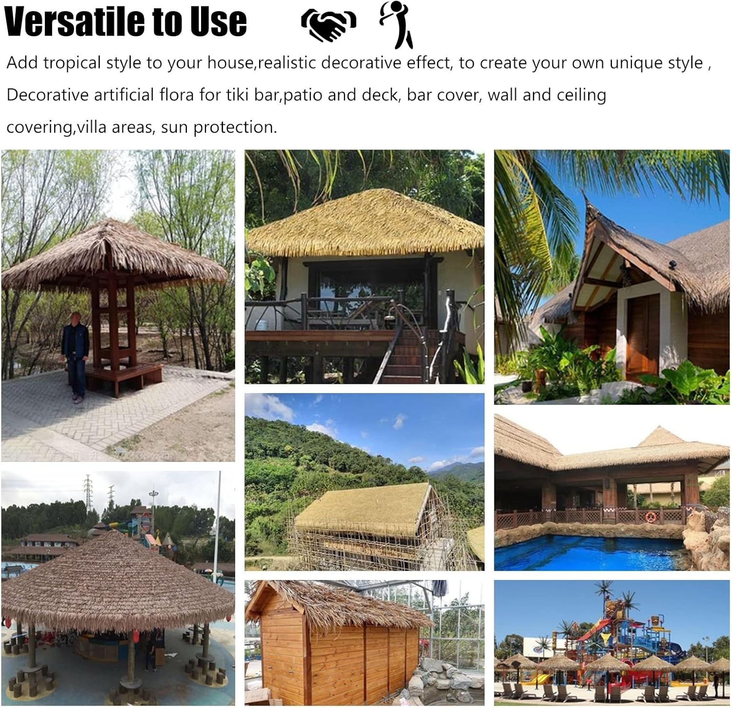 ---------- Waterproof and Fireproof Artificial ThatchThatch Panels are perfect for any custom size structure. These thatch panels are woven in the same manner as the rolls and umbrella covers. It capable of withstanding extremely high winds, dry and wet weather. Thatch is used to create a tropical touch to any project, such as, tiki bars, awnings or custom roof tops.Specifications: - Product Name: Simulation Thatch- Materials: Plastic PE Material- Color: Yellow- 1 Piece Panel Size: 50x50 cm/ 1.6x1.6 feet/ 19.7x19.7 inch- 1m²= 6 Piece ThatchFeature:- PE simulated thatch tile waterproof, fireproof and safe.- It work as roofing panel or shingle, on a pergola to keep rain off.- 1 panel weight: 300g, 1 panel size is 50cm×50cm.- One square meter needs to stack 6 pieces of thatch.- You can cut the pattern you want by yourself.- This artificial thatch roof very flame retardant, fire : B1.- Artificial thatch roof makes the house warm in winter and cool in . - There is no need for regular maintenance and replacement like natural thatch, which is more worry-free.Package Included: 1 x Synthetic Thatch Kind Reminder:- No matter what kind of questions you have, you can contact us, we look forward to your questions.- Color Difference: There might be a little difference between Item and pictures shown on the screen for digital devices are in different condition.- Size Deviation: Hand-measured, please allow a slight deviation.