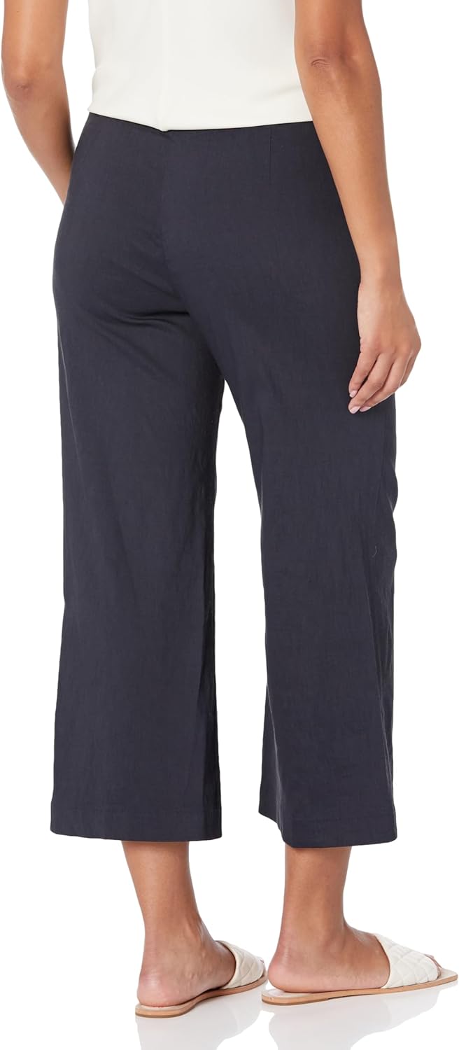 A cropped clean wide leg pant with slash pockets at front and front zipper closure.