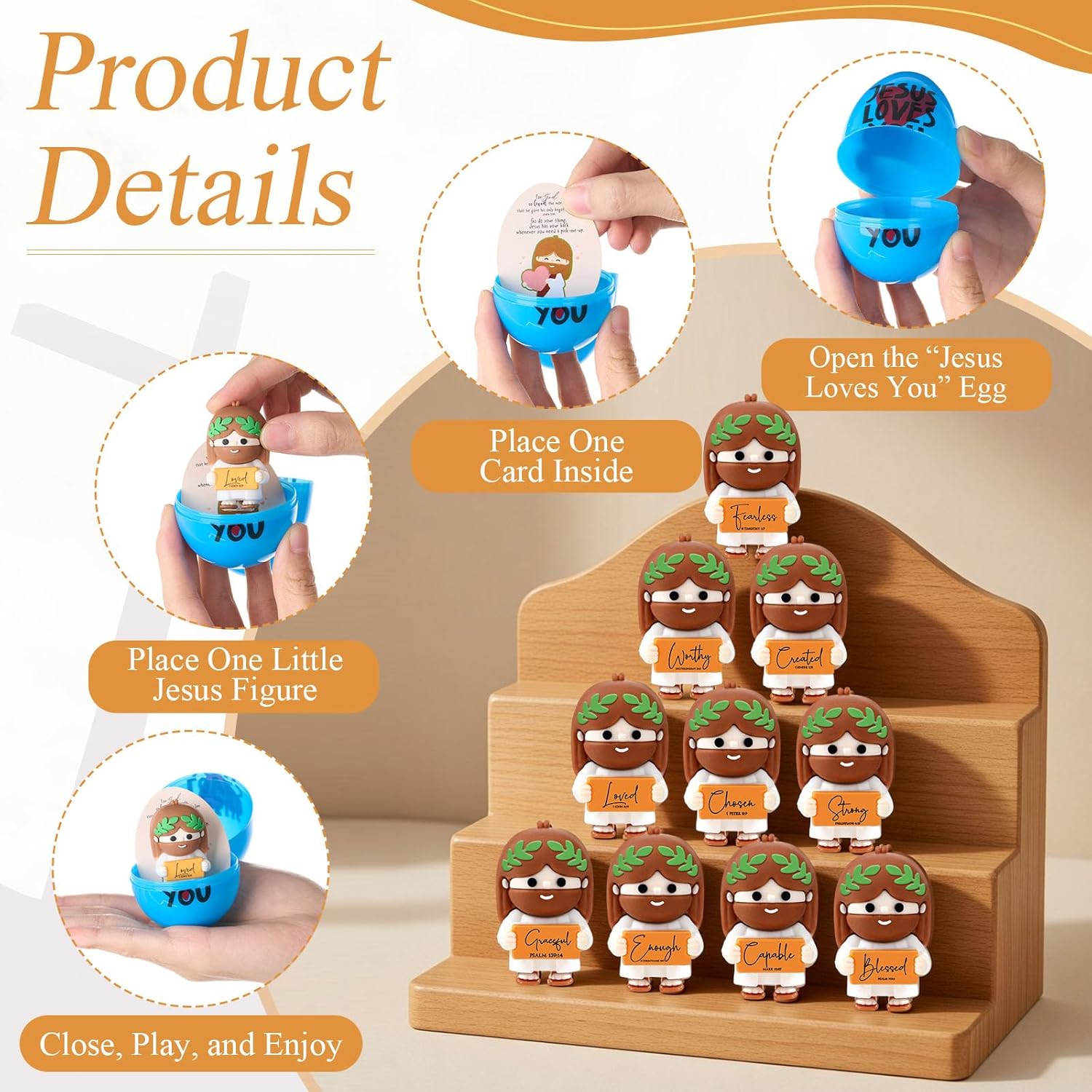 Features: These little Easter Jesus figurines are ideal gifts for friends, family and neighbors to show them care Our Easter religious gifts provide an ideal way to express faith, they serve as joyful reminders of the Christian faith, helping you share the message of faith with others Specifications: Material: Inspirational Jesus figures: PVC Bible verses cards: 300g coated paper Easter eggs: plastic Color: multicolor Size: Inspirational Jesus figures: about 1.57 x 0.98 inches/ 4 x 2.5 cm Bible verses cards: about 2.36 x 1.77 inches/ 6 x 4.5 cm Easter eggs: about 2.76 x 1.97 inches/ 7 x 5 cm Package includes: 60 x Inspirational Jesus figures 60 x Bible verses cards 60 x Easter eggs 60 x Adhesive dots Notes: Manual measurement, please allow slight errors on size. The color may exist a slight difference due to different screen displays