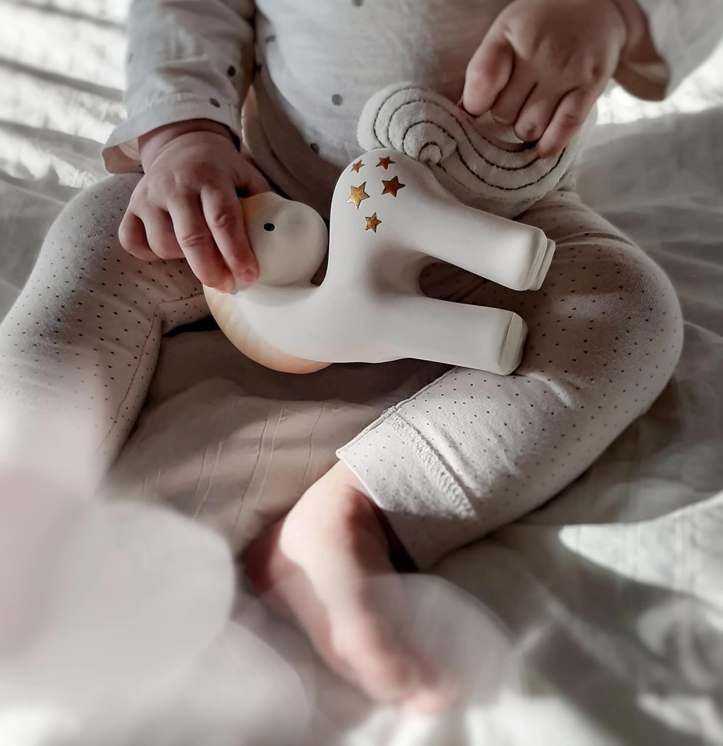 Shining Stars Unicorn from our Tikiri Fairytales collection. Made from organic all natural rubber and hand painted with soy-based ink, our Unicorn is a magical teething toy for little ones just learning to explore! Easy grip for smaller hands, the crinkle tail provides stimulation for babies as they discover their senses. Organic cotton tail and hand-painted stars in different colors.