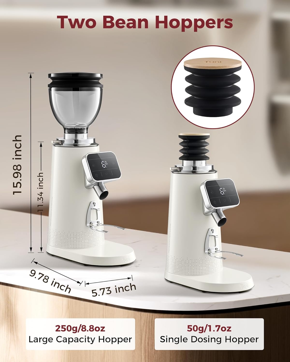๐๐๐ ๐๐ซ๐๐๐ข๐ฌ๐ข๐จ๐ง ๐๐ซ๐ข๐ง๐๐ข๐ง๐ ๐๐๐ญ๐ญ๐ข๐ง๐ ๐ฌ - The electric coffee grinder offers 100 adjustable grinding settings, allowing you to fine-tune the grind size from espresso to french press, which match different brewing method. 58mm Commercial Grade Brew System - The 58mm commercial-grade stainless steel filter, compared to the standard 51mm filter, creates a thinner coffee layer and achieves higher extraction efficiency with the same amount of grounds. With its plastic-free 58mm brewing head and low-pressure pre-soaking function, it delivers a more thorough extraction, resulting in an espresso with a refined taste and rich crema.