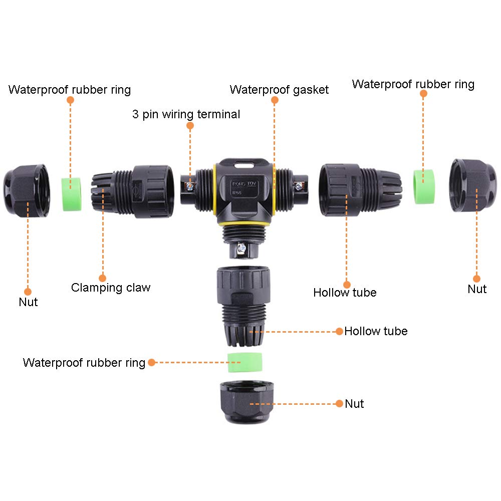 Features: The connector is made of high quality PA66 material with UL Listed, Resistance to low temperature and high temperature from -40℃ to 105℃. 3 Pin connectors include "Live wire" & "Neutral wire" & "Earth wire", suitable for the cable that the diameter is between 9mm to 12mm. IP68 waterproof protection level, suitable for a variety of indoor and outdoor wire connections. These connectors are suitable for connecting garden and outdoor billboard displays, tunnel lights, road landscape lights, underwater lights, street lights, etc. Specifications: Connector Type: M20 3 Pin T Type Rated Voltage: 400V Rated Current: 17.5A Cable Range: 9-12mm Waterproof level : IP68 Working Temperature: -40℃~105℃ Shell Material: PA66 Nylon Wire Terminal: Brass with nickel plating Size: See picturePackage: 5 x Waterproof wire connector