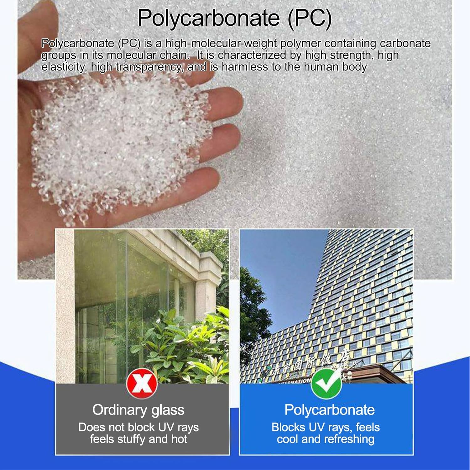 Our roofing panels provide exceptional light transmission while effectively blocking harmful UV rays, making them an ideal solution for various applications. Whether you're enhancing your greenhouse or creating a comfortable outdoor space, these panels foster an optimal environment for plants, flowers, and vegetables. Their versatility extends to being easily cut and shaped, allowing you to customize them to meet your specific needs.[Product Highlights]**Durable Polycarbonate Material**Made from high-quality polycarbonate (PC), these panels boast impressive strength and elasticity. They are impact-resistant, ensuring longevity and safety in diverse settings. Additionally, the panels are odorless, tasteless, and safe for human exposure, making them perfect for residential and commercial use.**UV-Resistant Coating**Our innovative UV-resistant coating protects against sun damage, minimizing heat buildup and preserving the integrity of your space. This feature not only enhances the comfort of your environment but also prolongs the life of the panels.**Flexible and Resilient Design**The panels are designed to be highly flexible and resilient, allowing for easy bending and curving. This adaptability makes them suitable for a wide range of structures, including carports, awnings, greenhouses, sunrooms, skylights, LED light boxes, sound barriers, and bus stop shelters.[Product Specifications]Product Name: Polycarbonate Roofing PanelColor: TransparentMaterial: PolycarbonateDimensions: Width x LengthThickness: Multiple options availableApplications: Ideal for carports, awnings, greenhouses, sunrooms, skylights, light boxes, sound barriers, and bus stop shelters.