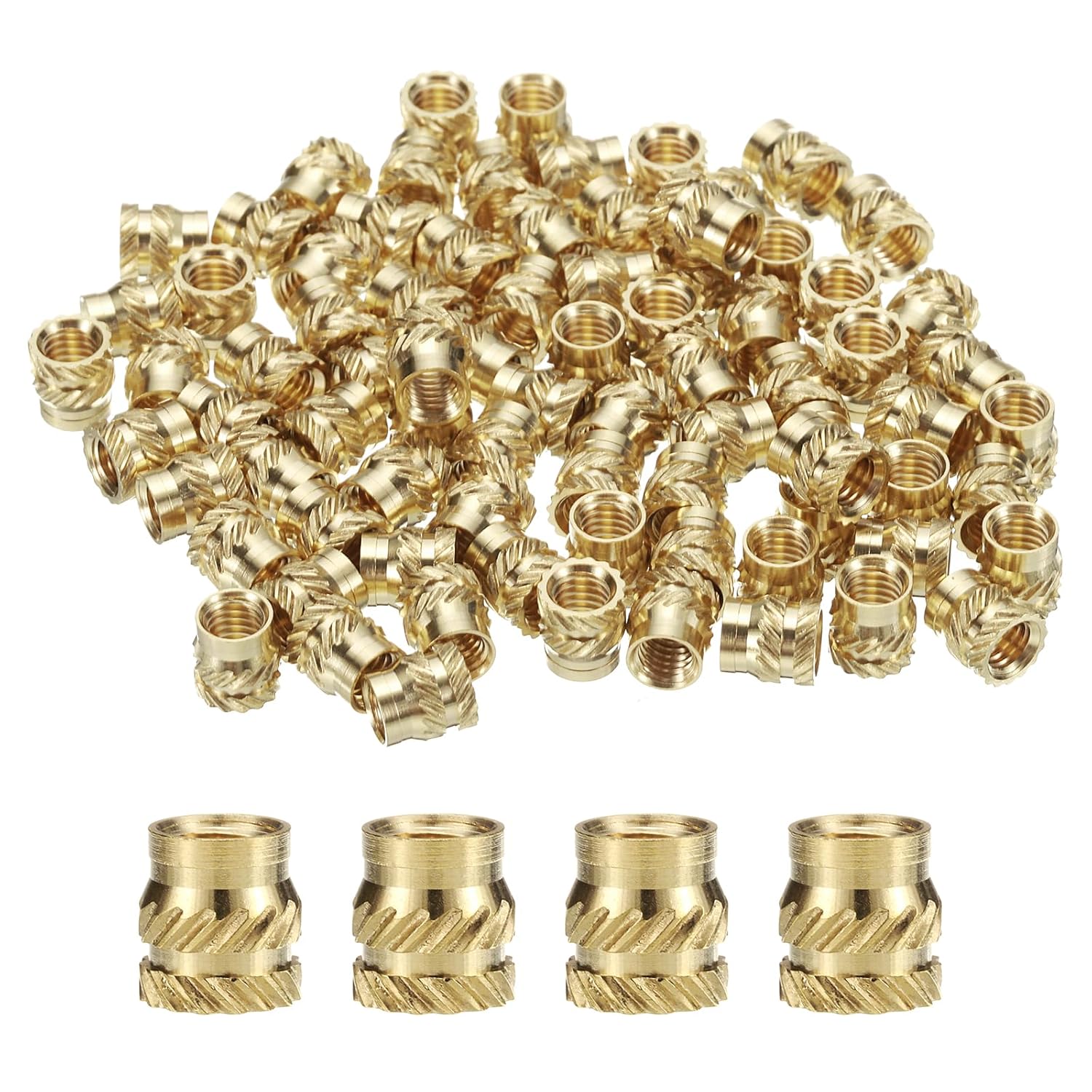 Descriptions:1. Material - Made of brass material, high hardness and durable. Provides good mechanical properties with increased corrosion and heat resistance.2. Feature - The embedding nut has a guide so there is no need for a counterbore or countersink. Smooth surface, firm and uniform, easy to install.3. Advantage - Due to the embossing process on the outer diameter of the insert, it forms certain friction and bites force with the brass insert after forming, which can be fixed on the inside so that it will not fall off easily. Has a certain torsion and tension.4. Application - Can be installed by ultrasonic or heat into the plastic matrix, or formed during the injection, widely used in 3D printing injection molding, computer products, electronic products, circuit board fixing, etc., to achieve tight fixing.