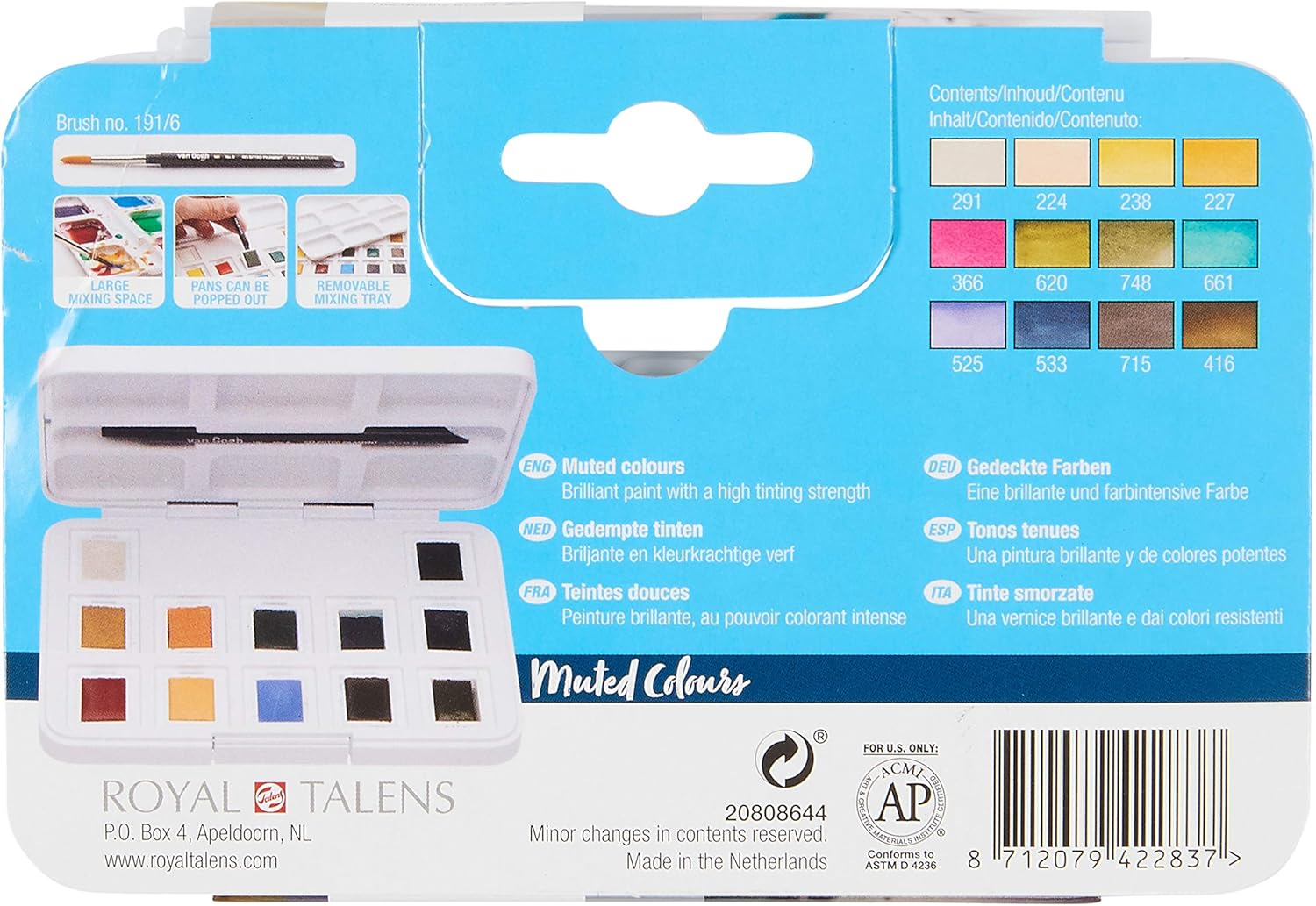 Van Gogh watercolors are rated as a student and artist level paint range. They feature brilliant, transparent, and intense colors with high tinting strength. Most colors are rated with the highest degree of lightfastness +++ (100+ years under museum conditions) with a few colors rated just one step below at ++ (25-100 years under museum conditions). Thanks to the purity and uniform viscosity, these watercolors are easy to work with and easy to mix. Proudly produced in Holland with stringent quality control for a consistent experience with every purchase. This 12-half pan watercolor set is packed in a plastic pocketbox, and also includes a round synthetic hair brush (size 6) and a mixing tray. Colors in this muted selection set are: Titanium Buff 291, Naples Yellow Red 224, Gamboge 238, Yellow Ochre 227, Quinacridone Rose 366, Olive Green 620, Davy's Grey 748, Turquoise Green 661, Lavender 525, Indigo 533, Neutral Tint 715, Sepia 416.