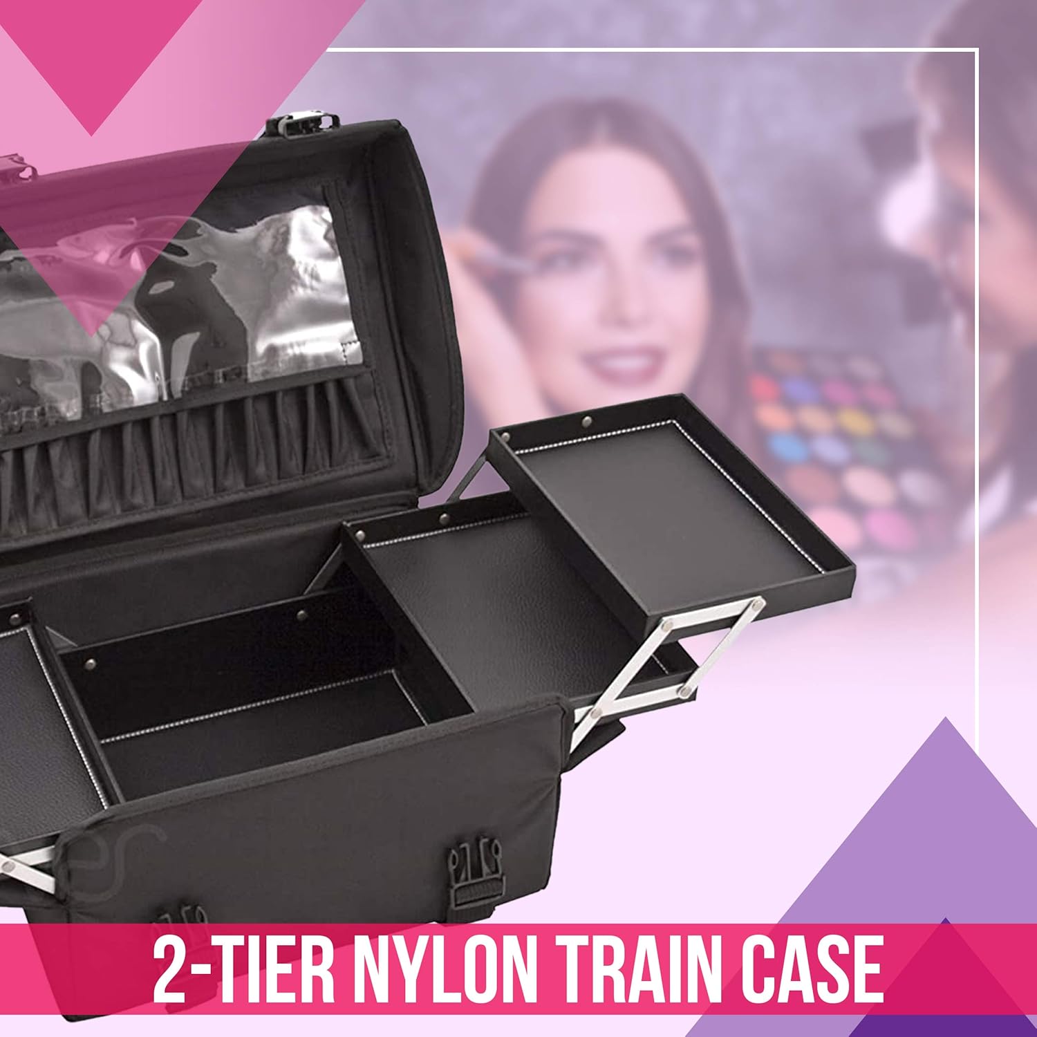Professional Makeup Artist Organizer Keep all your cosmetics neatly organized! This soft-sided portable display and storage accordion makeup box is perfect for protecting and easily transporting your wide array of makeup equipment and supplies to all grooming sessions. You’ll always know where to find the right eyeshadow, brush, nail polish, or lipstick for your next endeavor. Featuring 4 removable padded trays, a spacious center compartment for large tools, and a detachable brush holder this makeup travel suitcase comes in a beautiful black finish that will complement your style. Its heavy duty nylon finish provides extra durability, and the removable shoulder strap offers added comfort and grip. Designed with the most convenient dimensions to store, carry, and travel: Padded trays:10" x 6.75" x 1" Center compartment: 13.5" x 10" x 4" Overall case: 16" x 11.75" x 8"