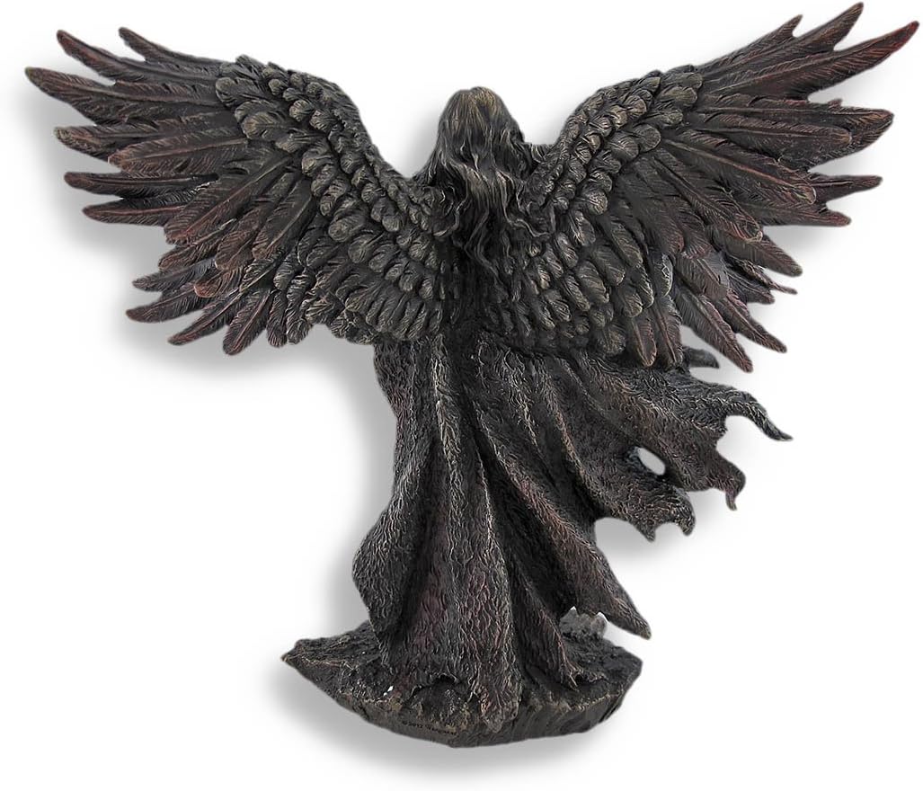 This six-winged seraph, or guardian angel, is of the highest rank, stoically standing watch over your home and loved ones with long sword in hand. The seraphim are known as the `burning ones` and are sometimes described as serpents. This wonderfully detailed statue has a bronzed finish accented by subtle hints of color seen in the reddish wing tips, cloak, and serpent and in the golden hilt of the sword. This piece is made of cast resin and measures 10 inches tall, 11 inches wide, and 4 1/2 inches deep. The bottom of the statue is covered with velour to prevent it from scratching delicate surfaces so you can display it anywhere in your home or office. This piece is a beautiful addition to your existing decor, and it makes a nice gift for a friend.