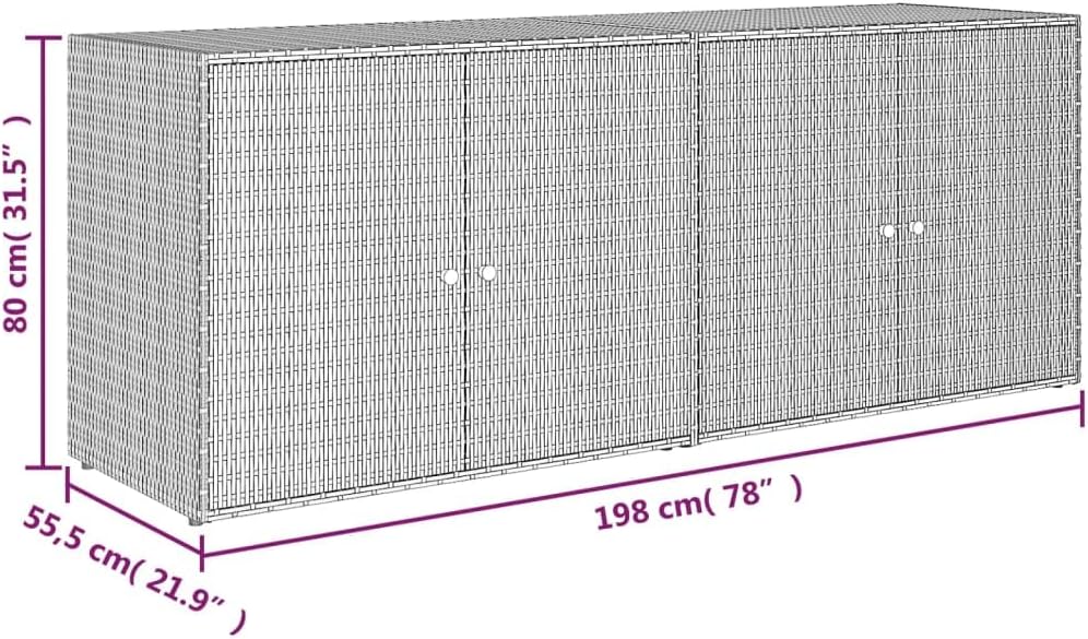 This outdoor storage cabinet is all about style and function, great for keeping your garden stuff organized. Made from high-quality poly rattan and powder-coated steel, it looks modern while being tough and ready to take on the weather.Ample Storage: Provides loads of room for your garden tools and outdoor gear, a must-have for anyone looking to tidy up their space.Weather- Material: Made from high-quality poly rattan, keeping your stuff safe from moisture and rain for worry-free outdoor use.Sturdy Metal Frame: The solid powder-coated steel construction prevents and boosts stability for long-lasting use, even when the weather's not great.Aesthetically Pleasing: The sleek grey finish adds to your outdoor style, fitting in greatly with your garden or patio while being functional.Convenient Access: The cabinet's got 270° swing hinge doors for easy storage access, making grabbing or storing tools a piece of cake whenever you need them.Color: Grey Shape: RectangularMaterial: Synthetic Poly RattanFinish: Powder-Coated Indoor/Outdoor: Outdoor OnlyNumber of Doors: 2Cover Included: NoRoom: Garden and TerraceCapacity: Ample storage for garden toolsDimensions: 77.9 x 77.9 x 31.5 in (W x L x H)Weight: 43.65 lbsLadder: NoBrand: vidaXLDelivery Contains: Garden storage cabinetAssembly Required: YesSKU: 319871EAN: 8720845670320