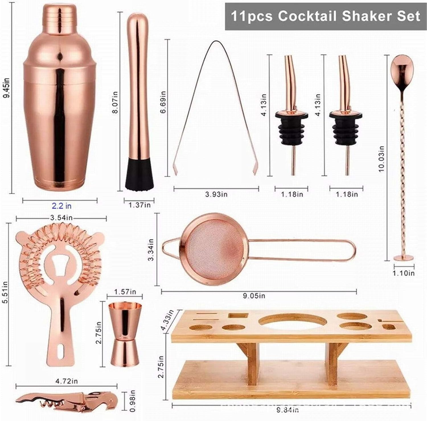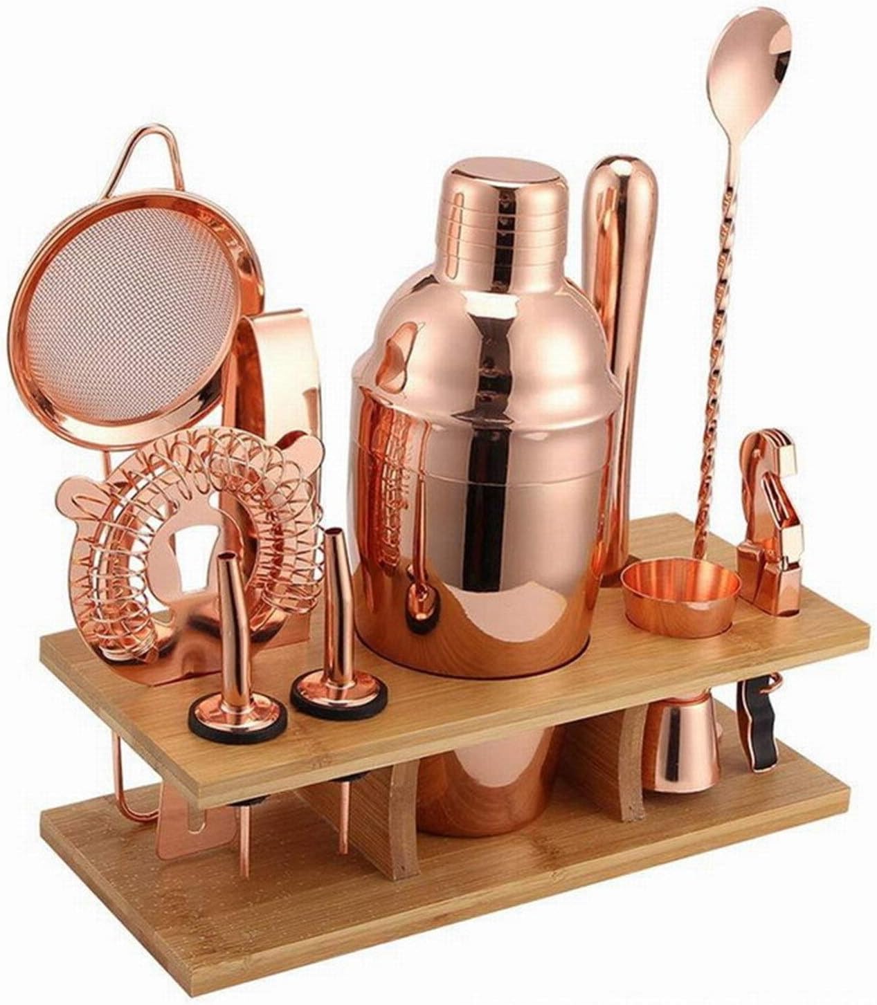 Bullet Points:1、: Made of food grade 304 stainless steel, this rose gold cocktail set has been weighed and thickened to ensure safety.2、Premium Shaker: The shaker is perfectly designed and it works with each other to provide a good watertight seal, which is suitable for shaking cocktails, such as Mojito cocktail and Margarita cocktail, or stirring Manhattan, Martini and old-fashioned and large jars.3、Professional Bartender Kit: This professional bartender kit is easy to use, making your life more convenient.4、Practical Cocktail Shaker Set: Can meet your bartending needs. Suitable for the kitchen, bar, living room or anywhere in the home, the stand is decorative.5、 Gift: A idea for birthday, anniversary, Christmas, housewarming, wedding, father's day, or any other occasion. When you get this gift, you can start the happy hour right away!Specifications:Material: Stainless steelCountry/Region of Origin: Australiaand Color: rose goldNumber of kits: 11Product size: please see the pictures for detailsWeight: about 1300g (2.8 LB)Packing List:Shaker x 1Muddler x 1Jigger x 1Liquor Pourer x 2Long Spoon x 1Corkscrew x 1Flat Strainer x 1Funnel x 1Ice Tongs x 1Wooden Stand x 1Highly practical with all-in-one bartending tools, it suits both beginners and seasoned mixologists, is easy to use and clean, for daily use, and also serves as gift for cocktail lovers, any home bar setup and drink-making experience