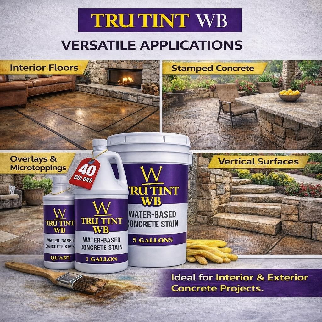 Tru Impressions water-based, penetrating concrete stain for use on nearly any concrete surface. Fast-drying. Semi-translucent, easy to layer to achieve mottled look. Can be sprayed, rolled, brushed or sponged. Easy to dilute for even lighter coating. UV stable for indoor and outdoor use. 1 gallon coverage approx. 250 sq ft. (1 quart approx 62 sq ft) Available in regular or concentrated forms. Should be sealed to fully lock in color. With 40 stock colors offered and custom blending available, these are a popular choice for contractors and DIYers alike. Color is more consistent between surfaces, and there are no harsh chemicals involved. Colors can be diluted, combined, layered, and manipulated in many ways to achieve the desired effects. Water-based concrete stains are suspensions of micro-fine or nano-pigments in a water-based solution of penetrating and binding agents. Because pigment color choices are so plentiful there is a wider color variety to choose from. A good water-based stain will give you time to work with it, yet will be permanent when cured out. Water-based stains work by flowing into and filling the concrete pores and bonding into the surface. Because they are more surface dependent for soaking in, you need to be sure proper prep is done to open up the surface to allow for a good, deep bond in the pores. C-Etch is a great product for that by safely etching the surface giving you plenty of porosity.