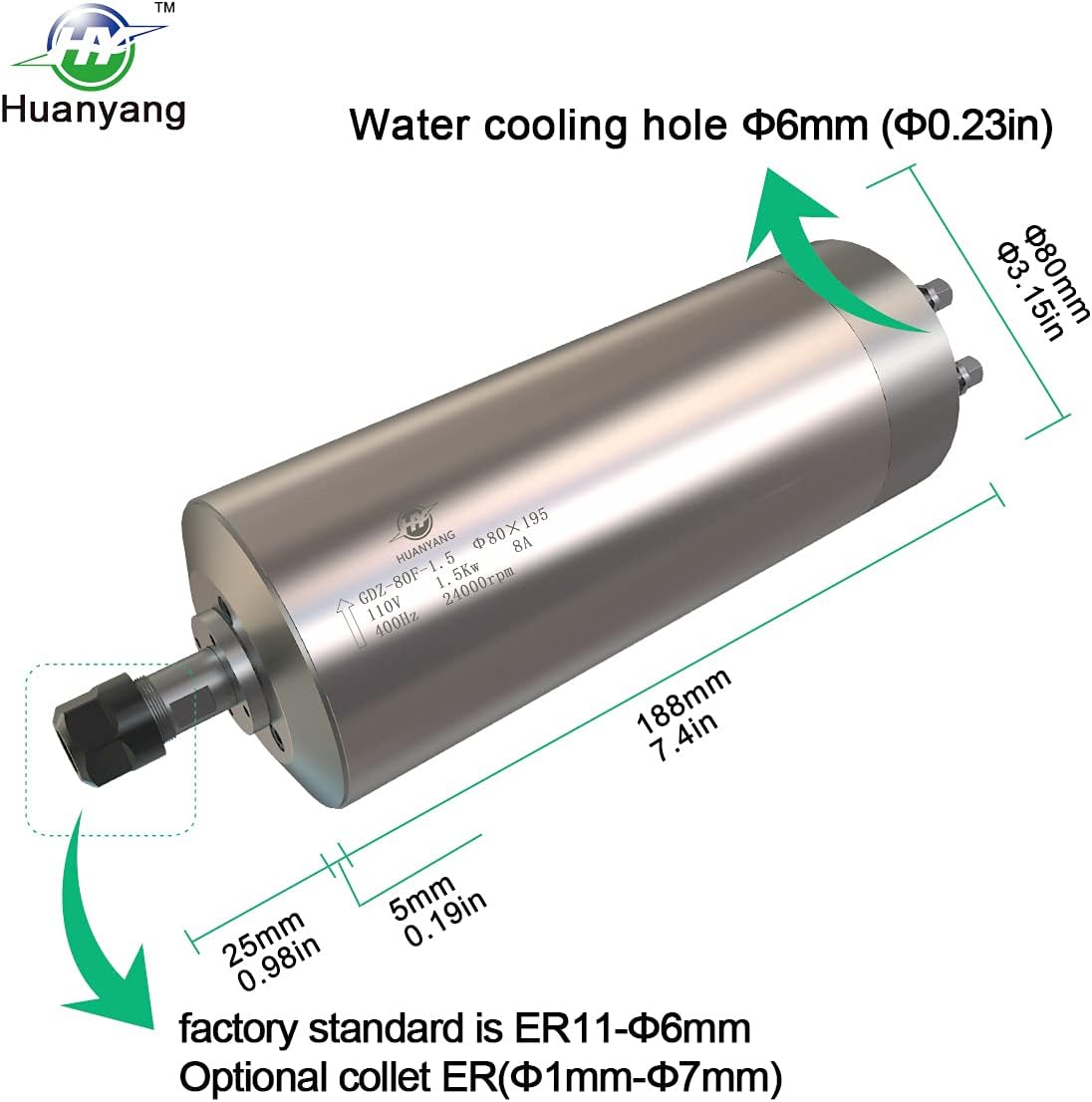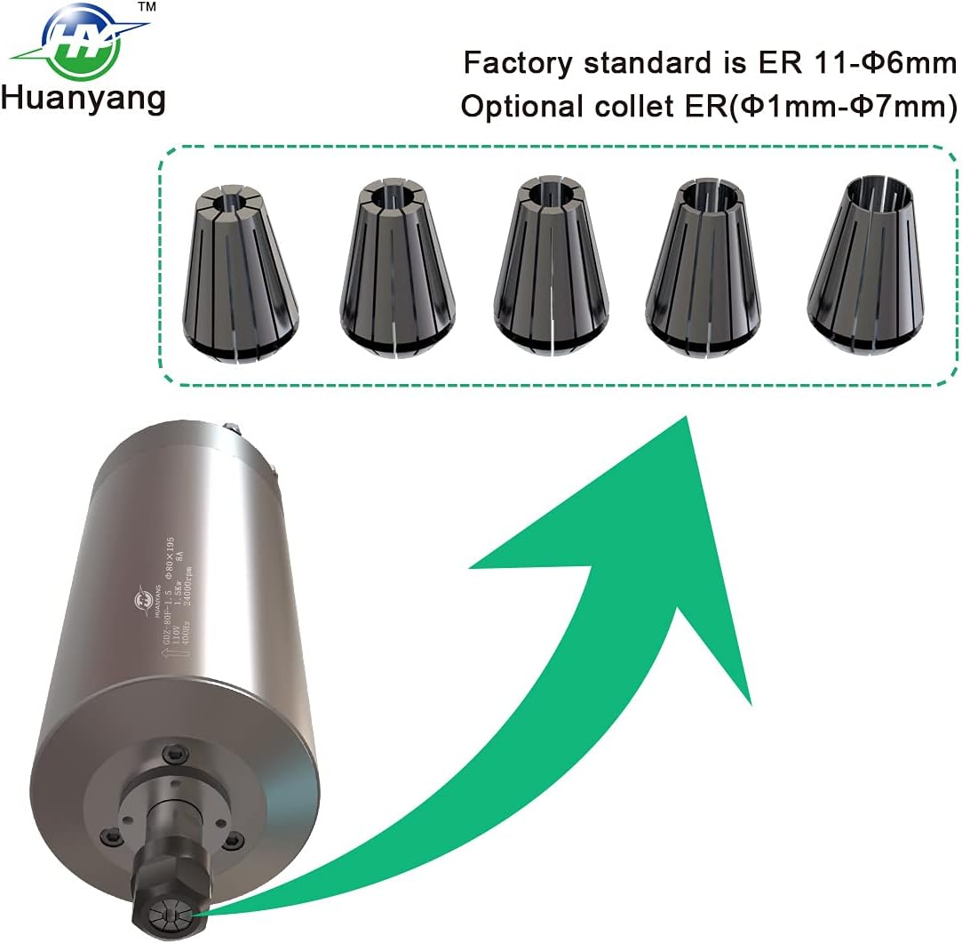Note: It is recommended to use this spindle for wood carving, as this can improve the service life of the bearings specification :●Material: The cover is made of stainless steel, and the water jacket is high compression casting aluminum tube, red copper coil. ●Bearing: 6002 bearing (3pcs)● Voltage and rated current: AC 110V, 8.5A● ● Safe speed range: 8000-24000 RPM●Radial runout:≤0.025mm clamping mandrel vibrates at 30mm to nut ● Frequencies: 400Hz●Size: 80*195 (mm)●Collet: ER11 collet, 6mm is standard●Nut model: ER11-A(B)●Cooling way: water cycling cooling way●Lubrication way: high temperature resistance grease lubrication●Power interface: YX20 water proof aviation plug marked with number 1, 2, 3, 4. Number 1, 2 and 3 interfaces are connected with inverter power U, V, W respectively. Number 4 is connected with earth wire