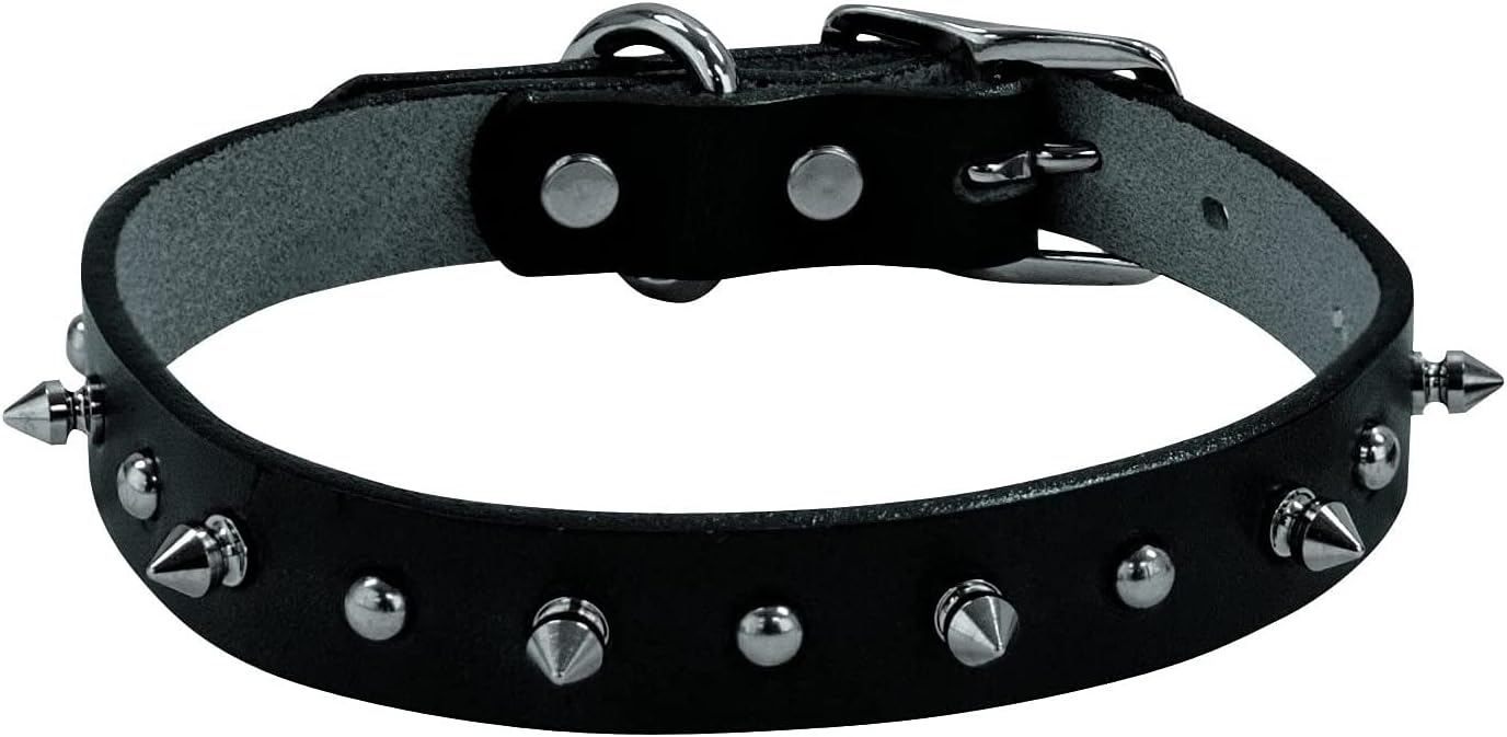 Constructed of premium quality black bridle leather, this doubled and stitched collar with smoothed and darkened edges for a refined, upscale look will turn heads with its carefully crafted and attractive design of nickel plated over brass spikes and spots. Features contrasting stitching for added style and flare. Each Weaver collar is measured to the middle hole to give you more flexibility in sizing. Chrome plated hardware.