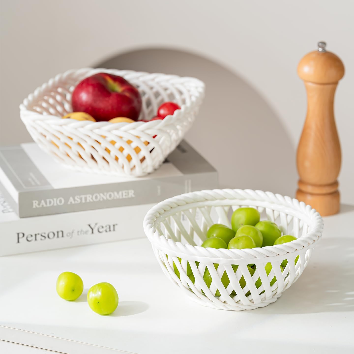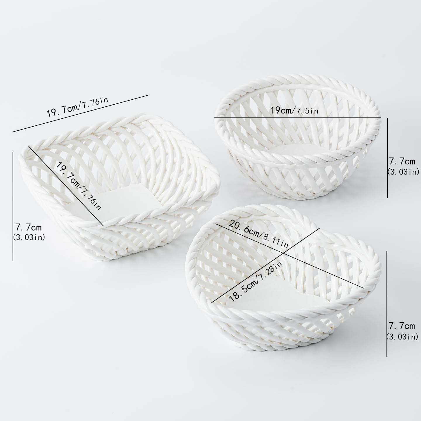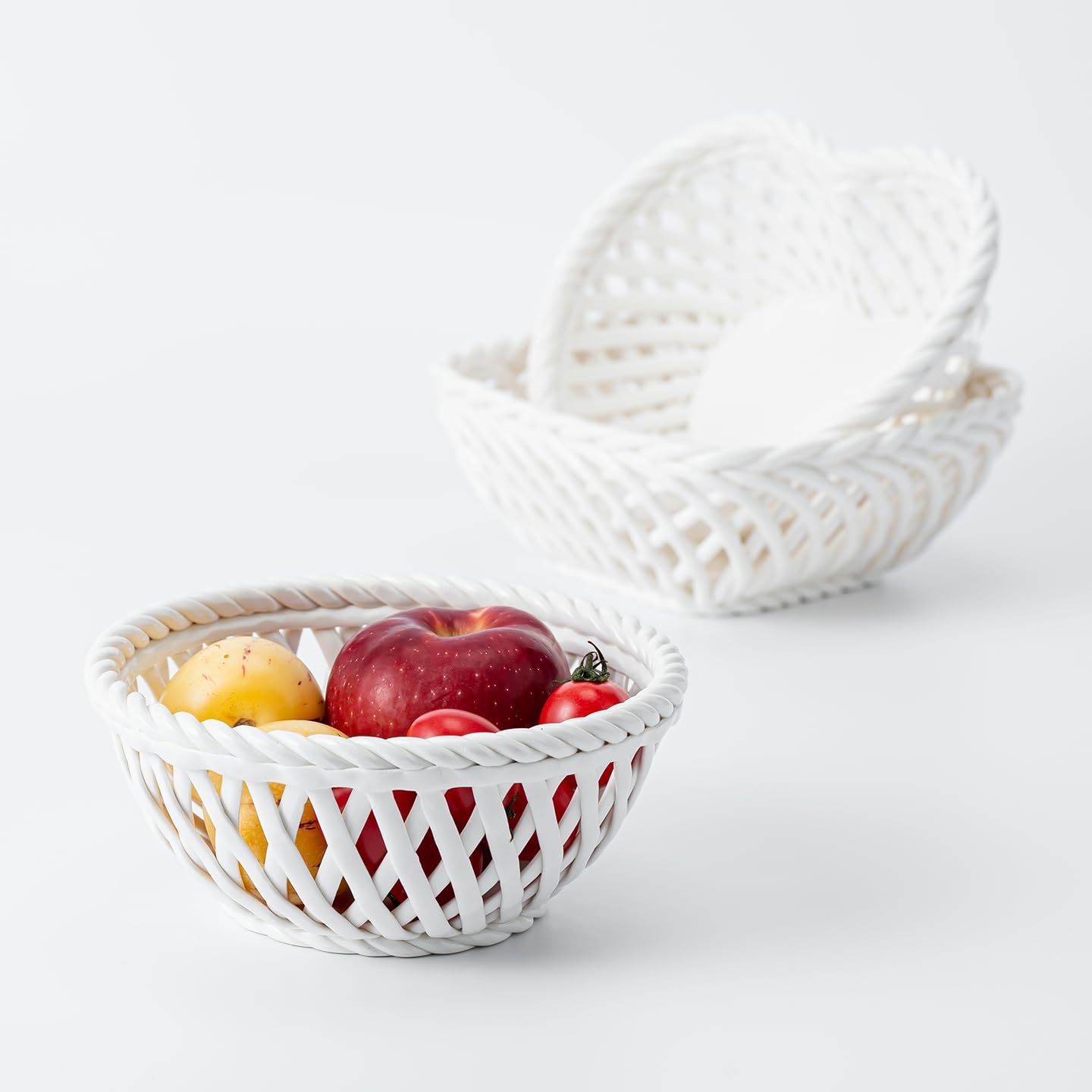Elevate your home decor with this elegant set of white ceramic lattice bowls featuring round, square, and heart shapes. The intricate woven pattern creates a stunning openwork design that allows light to play through the delicate latticework while maintaining structural integrity. Each bowl in this versatile collection serves beautifully as a decorative centerpiece, fruit basket, or artistic accent piece. The pristine white ceramic construction offers both durability and sophisticated style, perfectly complementing any interior design scheme from modern to traditional. The square bowl measures 7.48 inches across, providing ample space for displays or serving. These bowls can be used individually as statement pieces or grouped together for a striking arrangement. The detailed craftsmanship shines through in the precise geometric patterns and smooth finish. Perfect for displaying fresh fruit, decorative objects, or seasonal items, these dishwasher-safe bowls combine both beauty and practicality. The airy design creates beautiful shadow play while maintaining functionality, making them ideal for both everyday use and special occasions. Hand washing is recommended to preserve the bowl's pristine appearance.