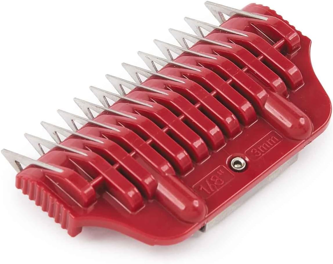Our Wide Blade Comb Attachments allow for extremely consistent styling. Enables you to get the coat down to a specific length so no need to spend hours scissoring. Attachment combs are a huge time saver because you won't need to use your scissors as often. Designed to soften the coat with their longer teeth and can offer an even and proportionate cut all over. Also ideal for leaving more hair on the dog's body. Metal combs are precision made of quality materials and extremely durable. Sizes are color coded for quick identification. Compatible with all A5 Wide blades. Helps provide even depth cuts Saves time by reducing scissoring Metal combs Precision made Sizes are color coded for quick identification Extremely durable. Sizes: 1/8 in, 3 mm 1/4 in, 6 mm 3/8 in, 10 mm 1/2 in, 13 mm 5/8 in, 16 mm 3/4 in, 19 mm 7/8 in, 22 mm 1 in, 25 mm 1 1/4, in 32 mm 1 1/2, in 38 mm Available for in single sizes, Full Set of all 10 sizes and colors, or Set of 6 most commonly used. Set of 6 sizes: 1/8 in, 3 mm 1/4 in, 6 mm 3/8 in, 10 mm 1/2 in, 13 mm 5/8 in, 16 mm 3/4 in, 19 mm Materials: Plastic and steel Care: Remove any hair on the guards using a small brush or a toothbrush. Wash the guards with mild dish soap, rinse with warm water
