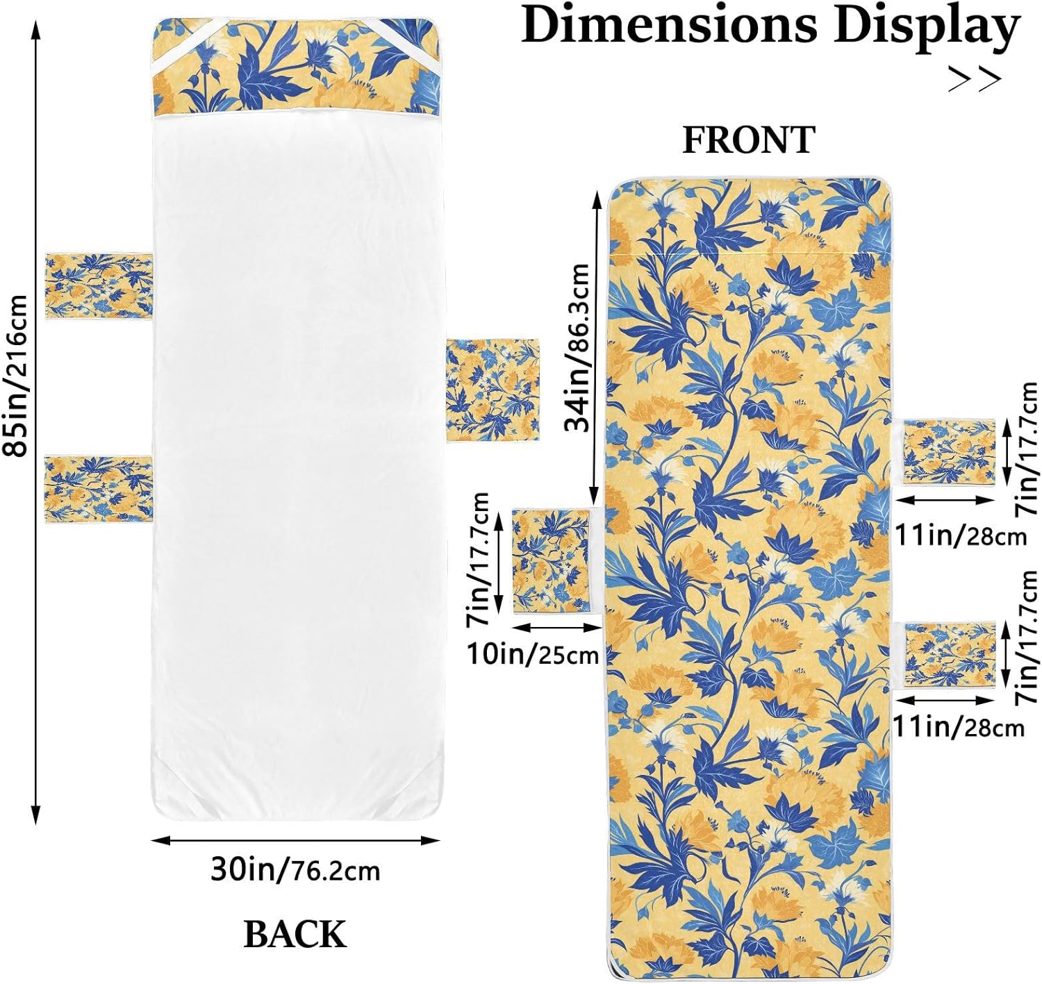 Specifications:Material: PolyesterSize: 30 x 85 inches/ 76.2 x 216 cmPackage includes: 1 x Beach Chair CoverNo Sliding: Deep 11'' pocket on the top and four corner expansion straps make sure your lounge chair cover to stay in place no matter how windy it gets. NO MORE SLIDING!Convenient Pockets: This Chaise Lounge Cushion Covers has three side pockets, convenient to carry your belongings like bath towels, slippers, phones, sunglasses, etc.Multiple Use: This Patio Lounge Chair Covers can fold up into a convenient shoulder strap bag, for pool areas, beach outings, garden furniture, courtyard seating, and outdoor trips.Easy to Care: These beach chair covers with pockets can be machine washed gently. Dry at a low temperature and take out of the dryer quickly to avoid wrinkles. Avoid bleach or soak in the water for a long time.Notes:Manual measurement, please allow slight errors on size.The color may exist a slight difference due to different screen displays.