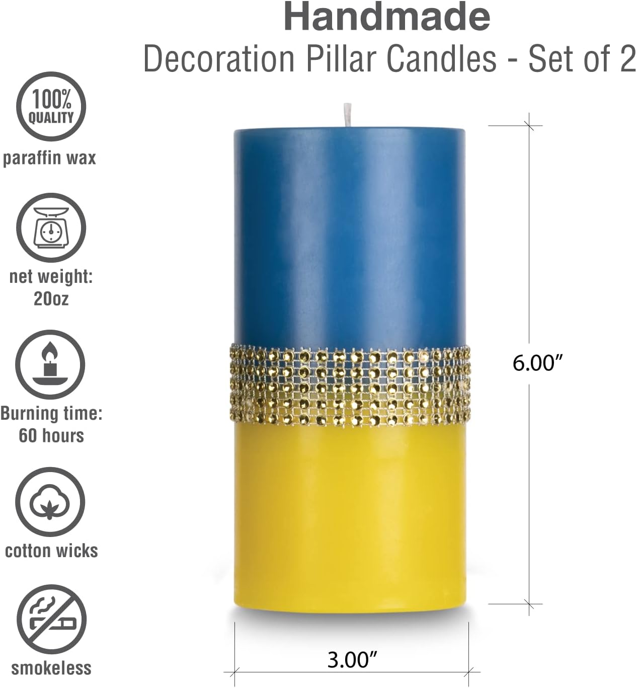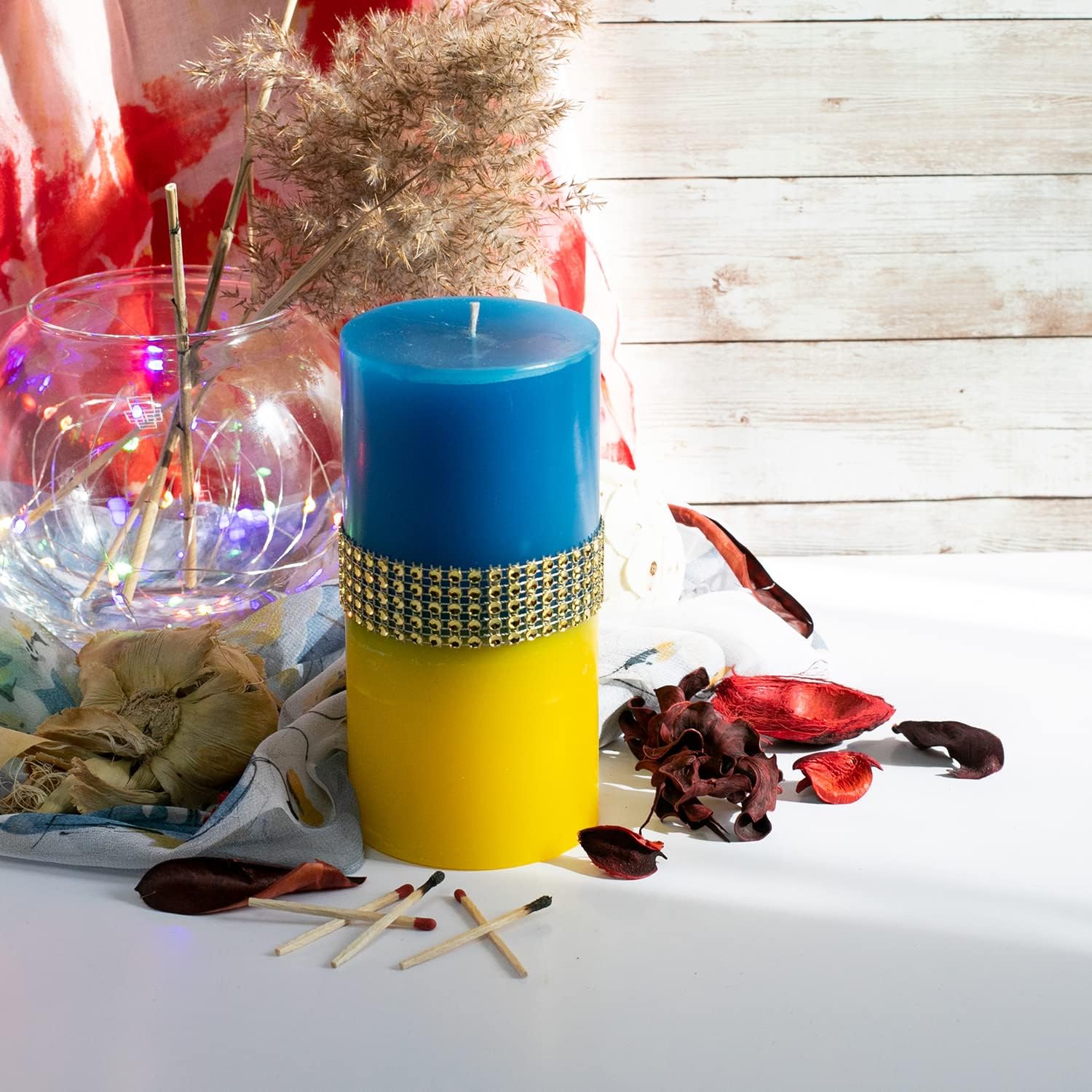 Introducing our HANDMADE paraffin wax Yellow Blue Ukrainian Flag pillar candles in a convenient set of 2. Each 3x6 inch pillar candle is made with lead-free and 100% cotton wicks, ensuring a clean and smoke-free burn every time. Each candle, scented or unscented, is crafted with the highest quality paraffin wax and care. Perfect for any occasion, our unscented or scented pillar candles are a versatile choice for Weddings, Birthdays, Anniversaries, Housewarming, Halloween, Thanksgiving, Christmas, Valentine's Day, or Mother's Day. With a long-lasting 60 hour burn time, you can enjoy the warm glow of our candles for hours on end. Plus, you can feel good about supporting a local business - all of our candles are proudly MADE in the USA. To ensure your candles arrive in perfect condition, we individually wrap each pillar candle in bubble wrap before packaging. For the best results, we recommend burning each pillar candle for 3 hours on the first burn. Always use an appropriate candle holder and place candles on a stable, heat-resistant surface away from drafts and flammable materials. Keep the wick trimmed to approximately ¼ inch before each use and never move the candle while burning or if the wax is hot. Also, never place candles directly on furniture surfaces and never leave a burning candle unattended. Thank you for choosing our handmade Yellow Blue Ukrainian Flag pillar candles. Shop with confidence knowing that each candle is crafted with the highest quality paraffin wax and love.