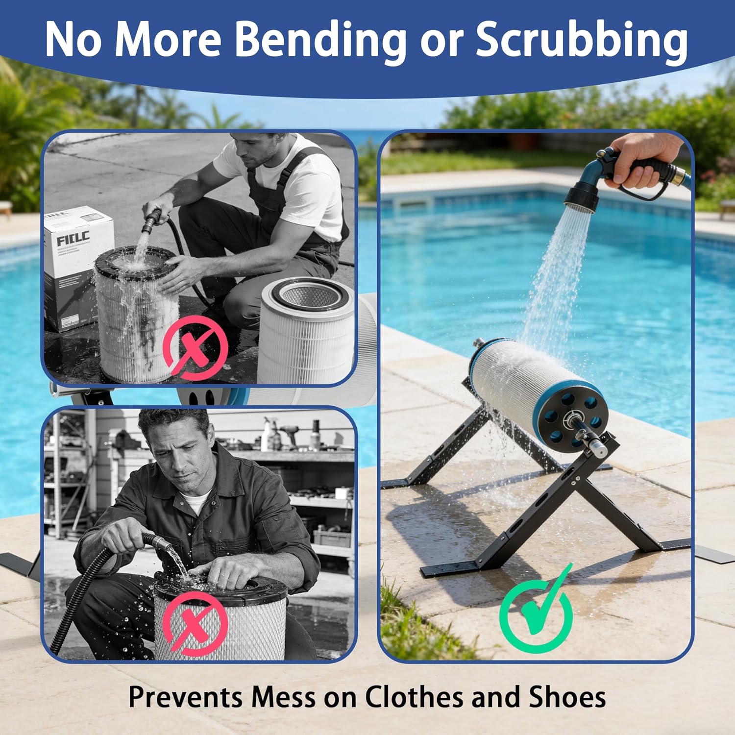 Stop struggling with dirty pool filters. The 360° Pool Filter Cartridge Cleaner delivers fast, deep cleaning with zero hassle.✅ 360° Water-Powered CleaningHigh-pressure water spins the filter 360°, flushing out dirt trapped deep in the pleats. Filters come out like new—extending lifespan and saving you money.✅ Clean in One RinseNo more scrubbing or repeated washing. One rinse does it all—no bending over and no contact with dirty water.✅ Fits 3", 4" & 6" CartridgesAdjustable bracket securely holds all standard sizes. Perfect for home or professional use.✅ Tool-Free AssemblyIncludes all parts and instructions. Sets up in minutes, disassembles for compact storage.✅ Stable & SafeNon-slip base and secure clamp keep everything in place. No moving, no splashing.Ideal for pools, spas, and hot tubs.